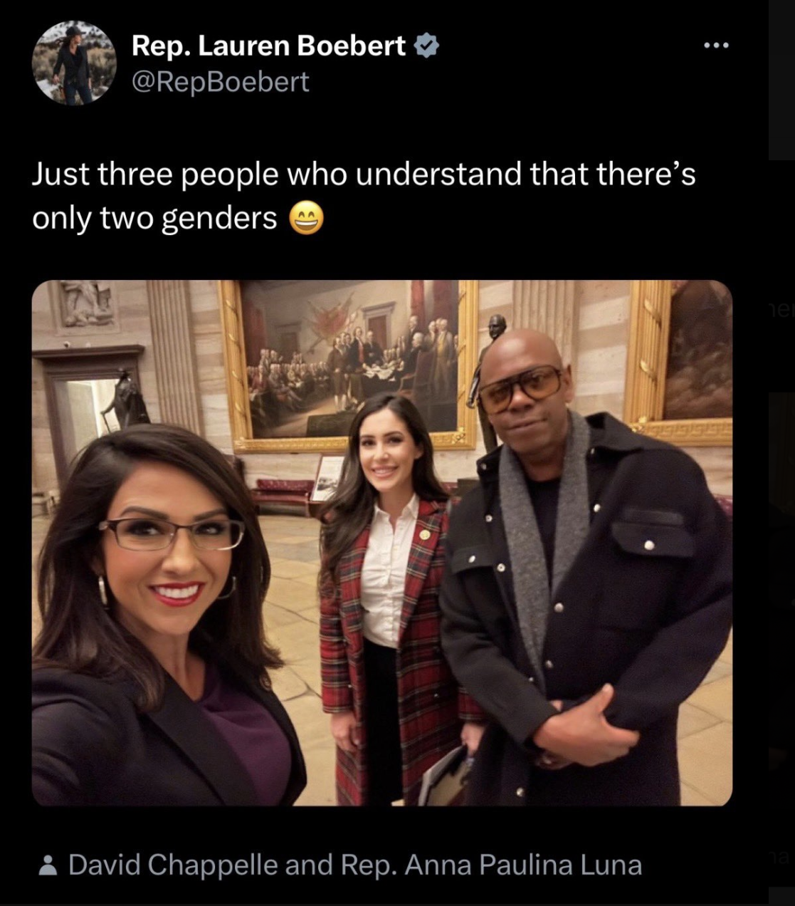 In November, comedian Dave Chappelle drew the ire of social media users after posing for a picture with Boebert and Florida rep Anna Paulina Luna, which was posted online with the caption, “Just three people who understand that there’s only two genders.” The gender reference stems from negative comments Chappelle has made toward transgender people in his comedy specials. The post was later deleted.