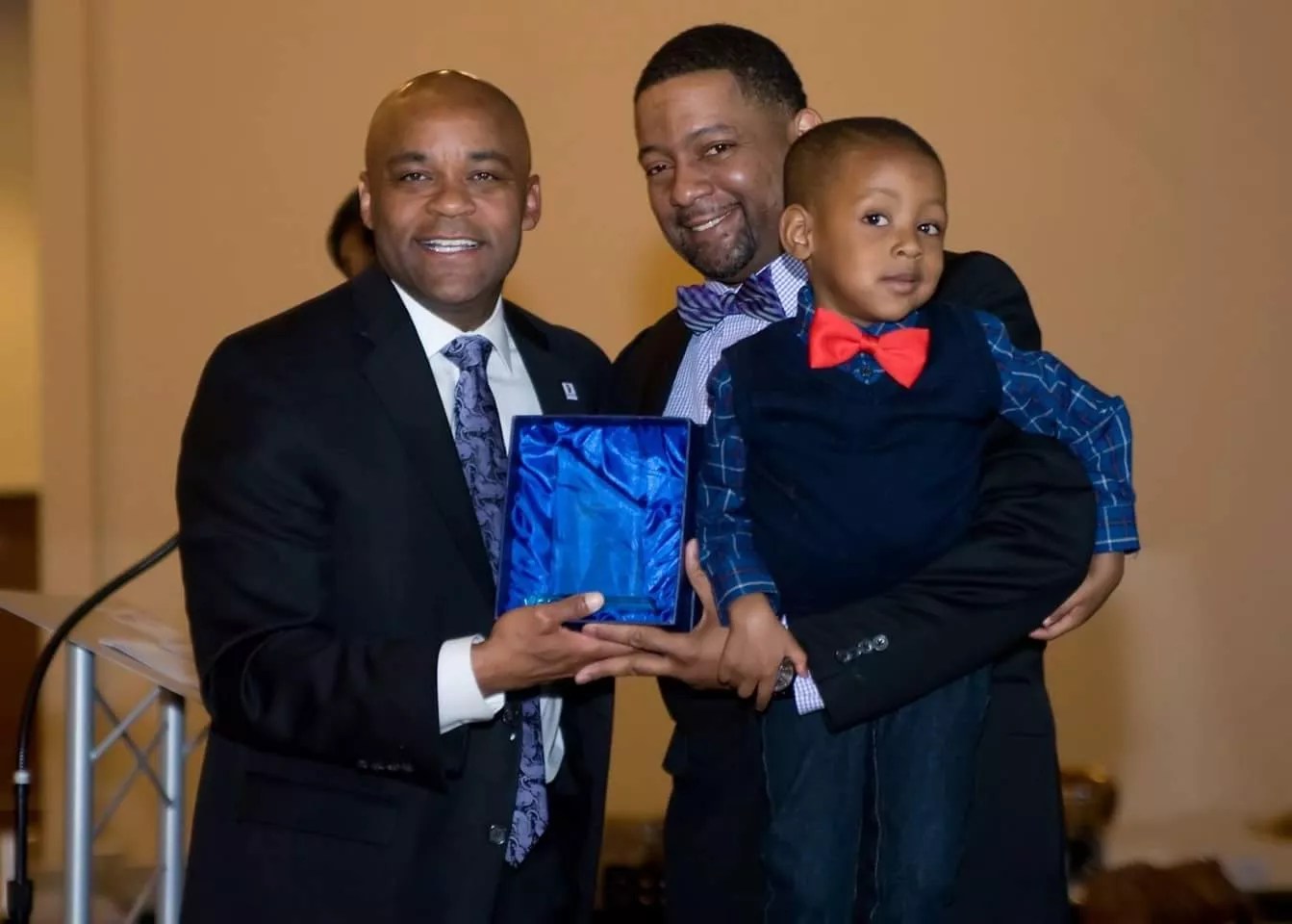 Jonathan McMillan and son, Julian, accepting the My Brother’s Keeper Award from Mayor Michael Hancock.