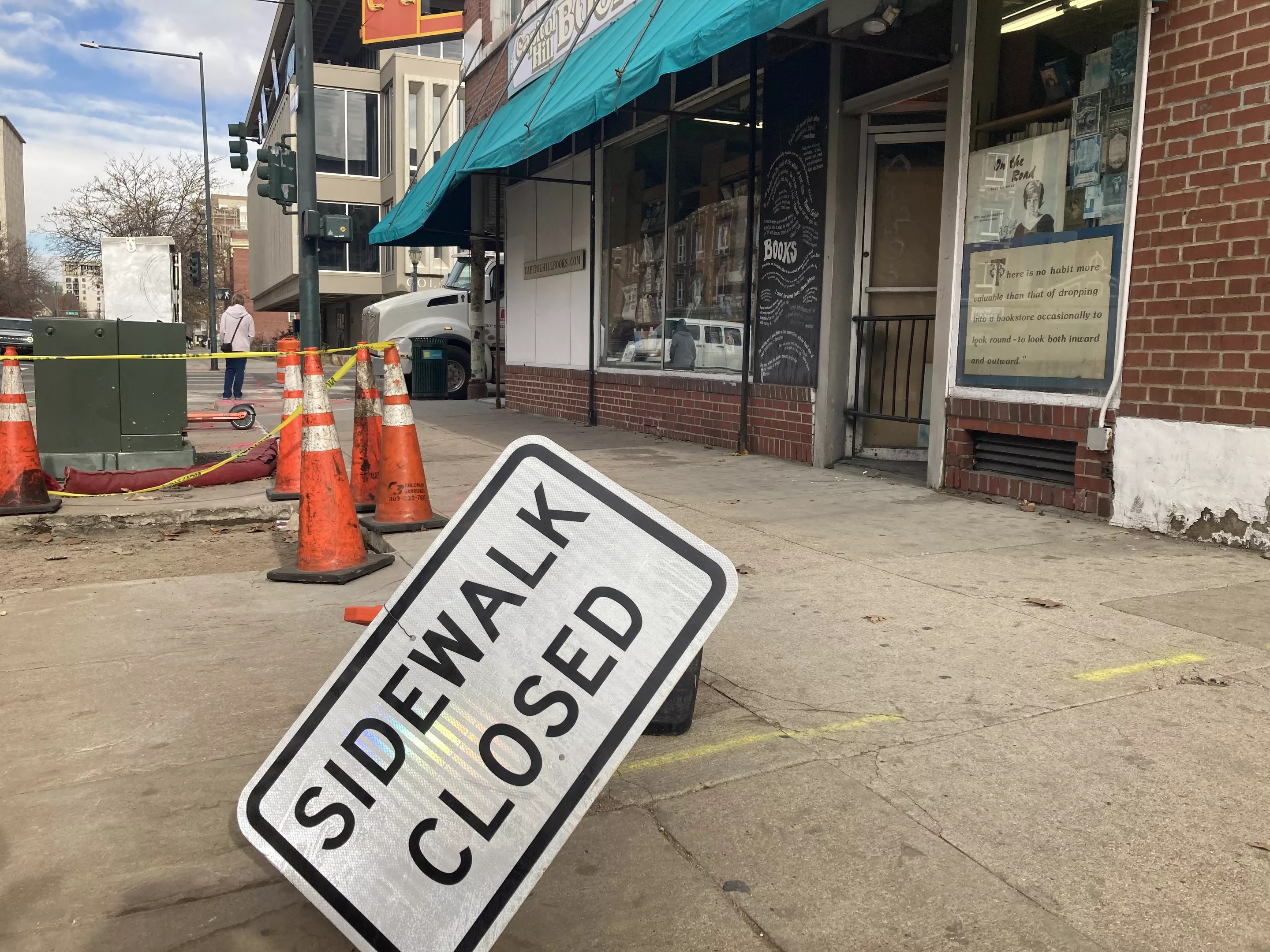 Visible through the store’s large windows, workers tear up the asphalt along the curbs of Colfax. Lanes of traffic are coned off. Cars honk as they’re funneled into congested bottlenecks. Trying to dodge obstacles, RTD buses on the 16 route can barely clear the sharp turn onto Grant. Pedestrians try to navigate the hectic intersection, confused by “Sidewalk Closed” signs that are bent and overturned.