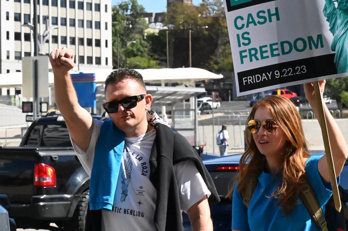 Nick Pacheco holds up his fist at a September 22 rally for the Denver Basic Income Project.