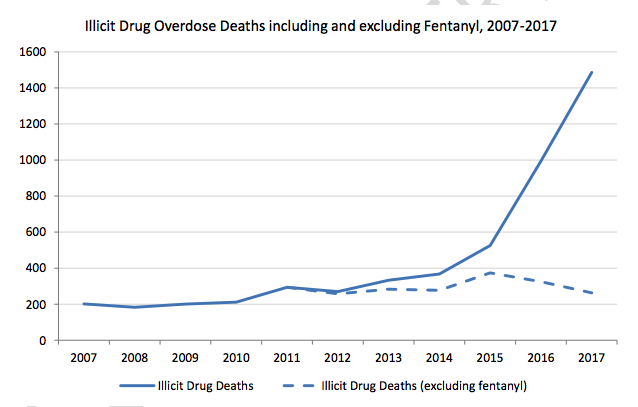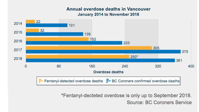 While 375 deaths is still higher than Denver’s 201 deaths in 2017, there is another key difference between what’s going on in Vancouver and what’s happening in Denver, and that’s the prevalence of fentanyl. Along with Vancouver’s precipitous rise in overdose deaths (as seen on the chart below), there has been an increasing prevalence of fentanyl, a synthetic opioid that’s far more potent and unpredictable than heroin.