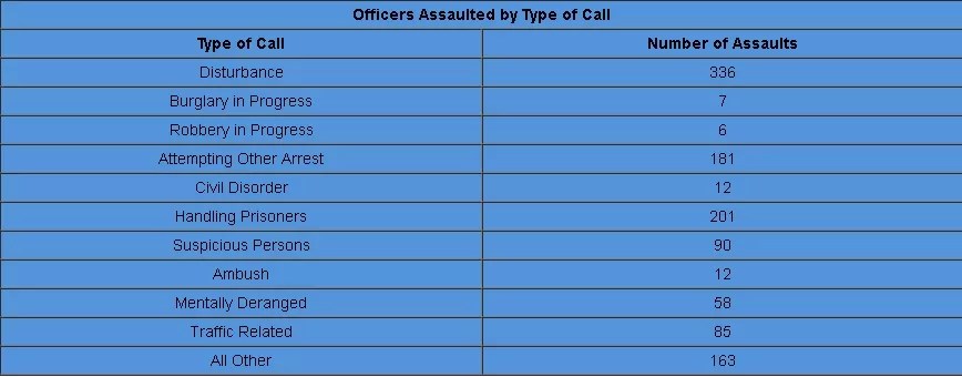 The stats show that disturbance calls are by far the most likely to result in a suspect attacking an officer, which make sense given that in such circumstances, emotions typically run high. The number of assaults in those situations was 336 in 2015.