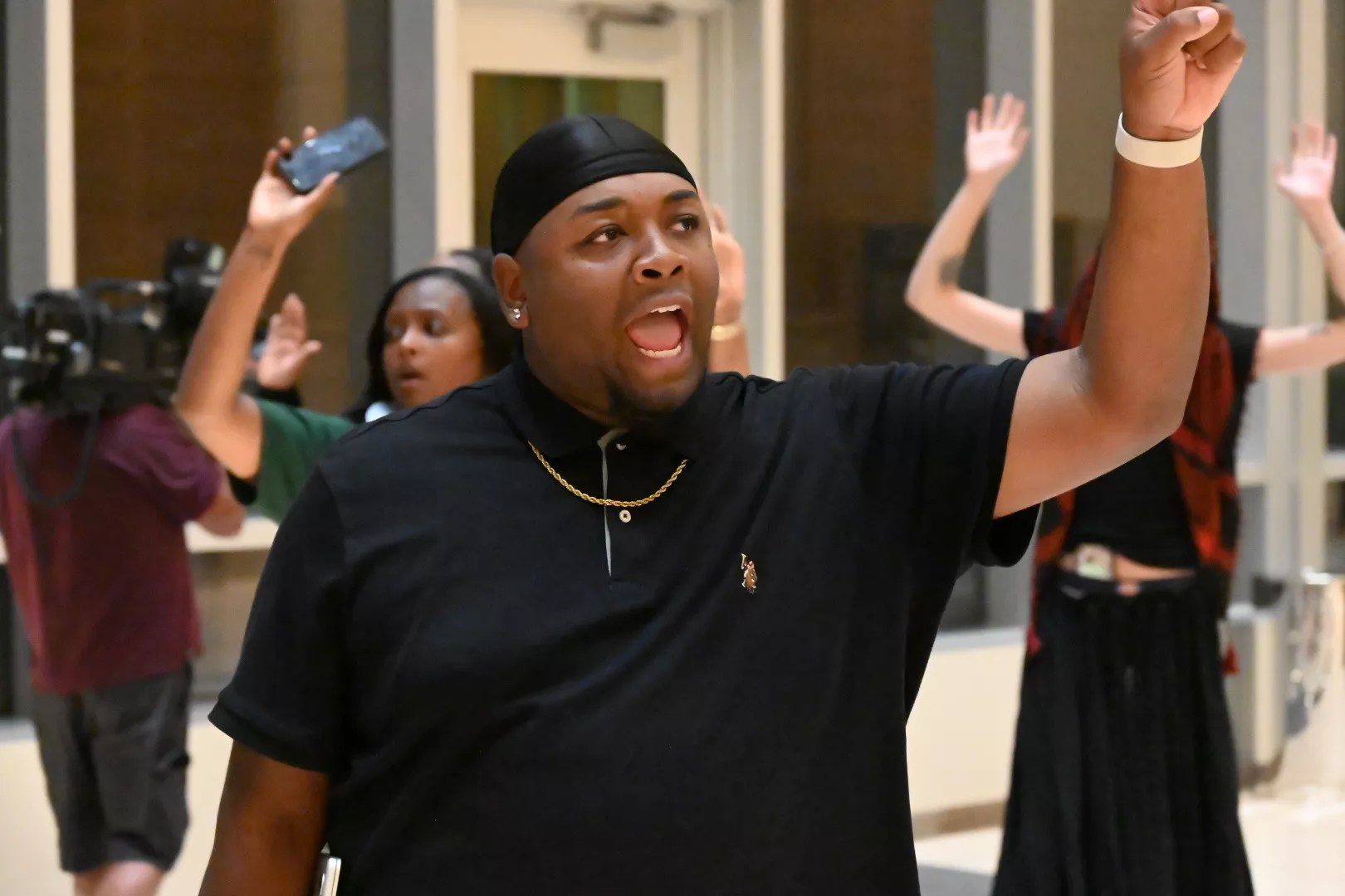 Auon’tai Anderson led protesters after they were led out of the Aurora City Council chambers on August 26.
