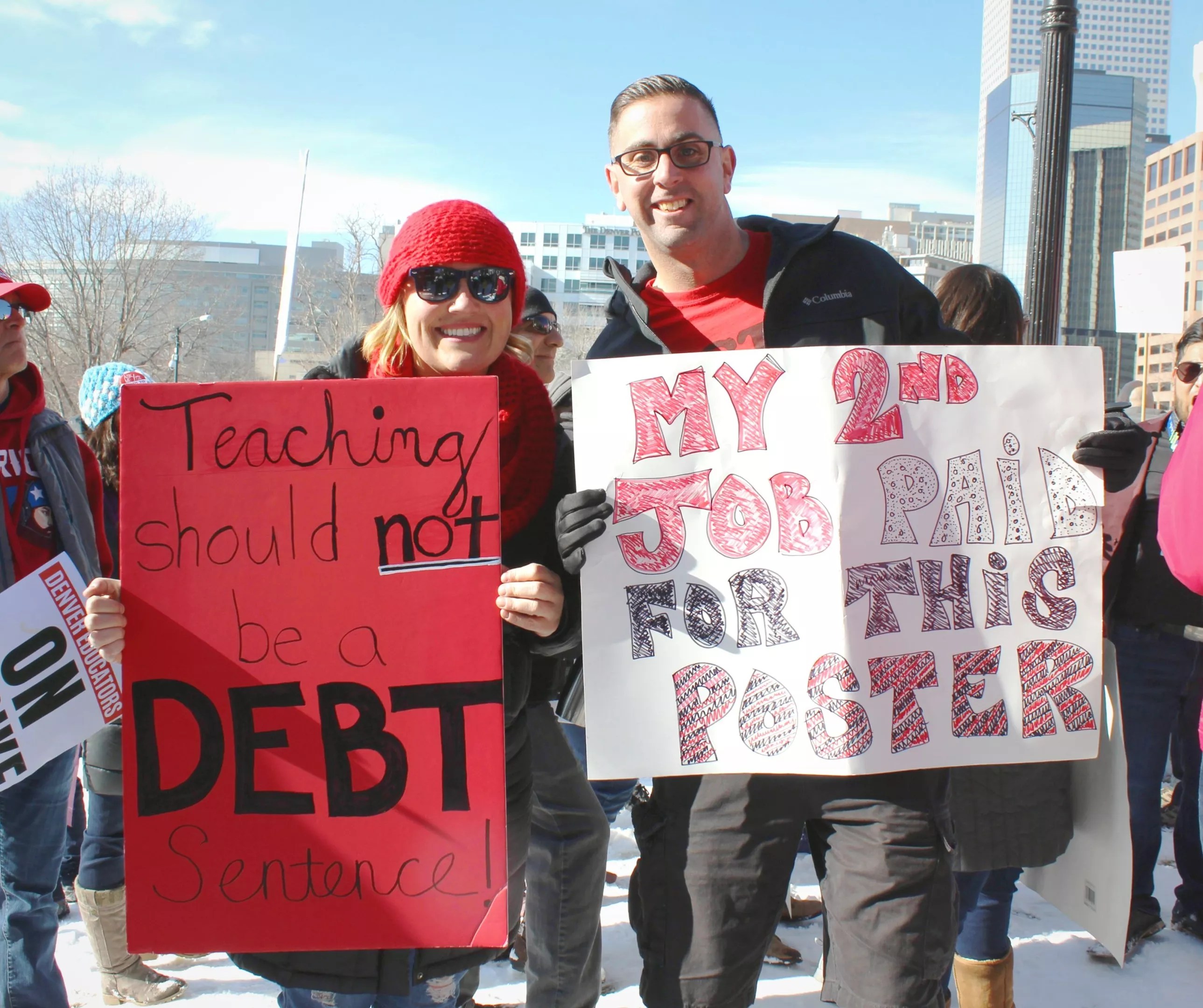 Denver teachers Becky Carlson, left, and DJ Bruen demonstrated outside the Colorado State Capitol on Monday, February 11, during a three-day strike.