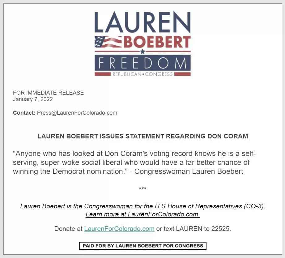 And so the 2022 election begins in earnest. The journey to unseat Lauren Boebert will undoubtedly be a rough ride: Boebert reportedly ended 2021 with a $2 million war chest, only some of which will go to hyper-inflated mileage reimbursement and settling outstanding debt for her failing restaurant. But as of now, Coram and the voters of CD3 have the opportunity to take the wheel.