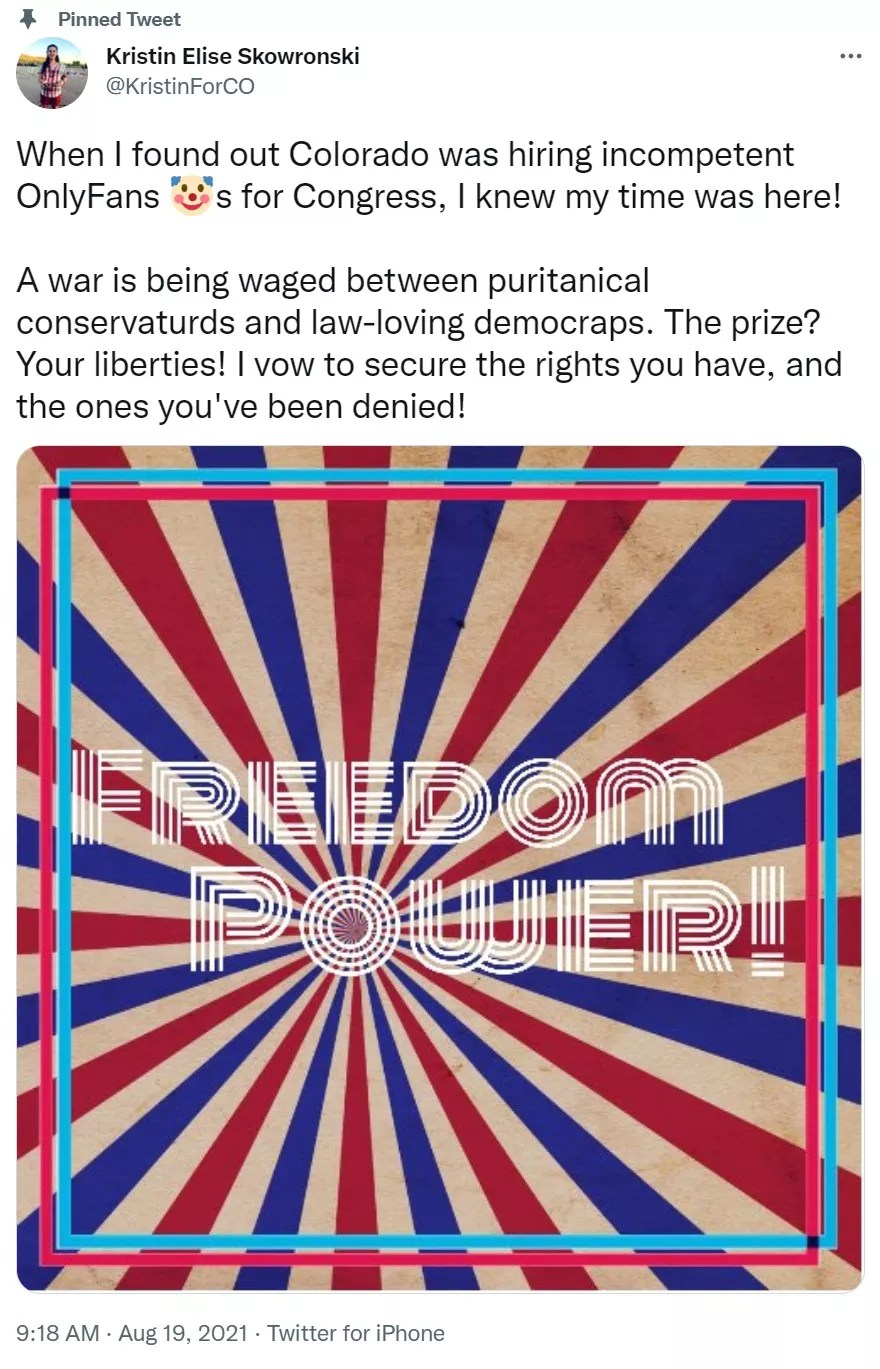 There’s an Independent candidate, Kristin Skowronski, whose online presence so far appears limited to a LinkedIn profile and a Twitter account. Her platform can be summed up by her top pinned Tweet: “A war is being waged between puritanical conservaturds and law-loving democraps. The prize? Your liberties! I vow to secure the rights you have, and the ones you’ve been denied!” The serious abuse of exclamation points in that quote might be enough to eliminate her already, and Boebert already has the demagoguery angle played.