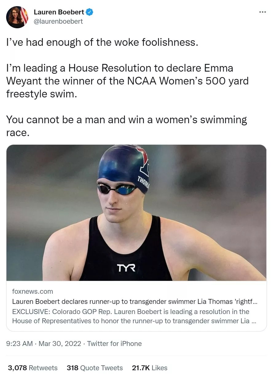 But the low academic bar is not the real problem: It’s the anger that Boebert has weaponized. Just look at how she’s grabbed on to the issue of transgender men and women in sports. In the last week, she’s posted about the subject seven times – an average of once every day. “I’ve had enough of the woke foolishness,” she said on March 30, declaring that she’s “leading a House Resolution to declare Emma Weyant the winner of the NCAA Women’s 500 yard freestyle swim,” in which transgender athlete Lia Thomas took top honors. She ended with this: “You cannot be a man and win a women’s swimming race.”
