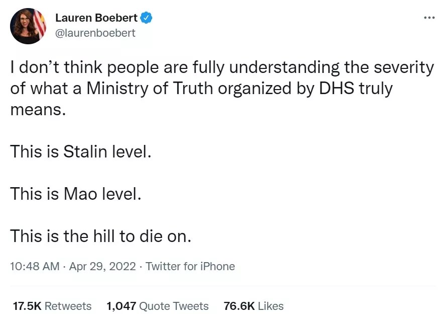 Boebert joined Arkansas Senator and He-Who-Walks-Behind-the-Rows preacher Tom Cotton in presenting companion pieces of legislation that would abort the nascent Disinformation Governance Board by defunding it. “The Department of Homeland Security should not be in the business of censoring free speech on Twitter and Facebook,” said Boebert in a statement released on her website. Which is a great example of the disinformation facing America today: making a case that does not exist to people who don’t know it doesn’t exist, and in that manner bringing it to life, if only in the ghostly half-life of people who don’t know any better. There’s a reason why, back in 2016, Trump said, “I love the uneducated.” Because he and his disciples depend on the disinformation that motivates them.