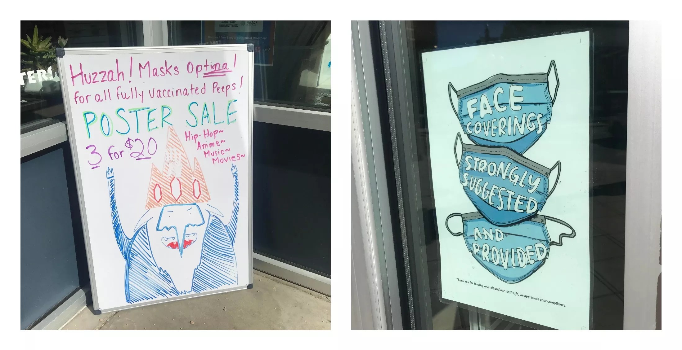 Businesses with two different approaches to masking after the mandatory order’s expiration, as seen on Boulder’s Pearl Street Mall circa February 20.