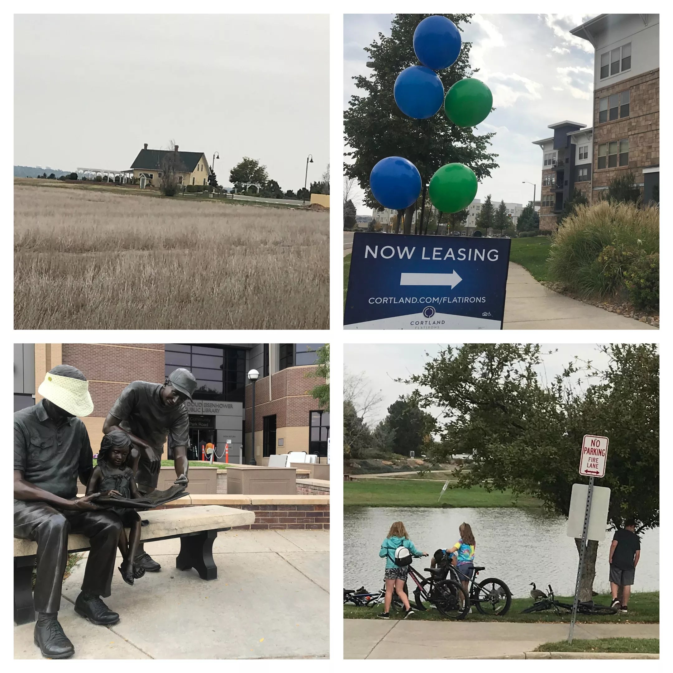 Clockwise from upper left: Open space along Broomfield’s Main Street, an invitation to tour the Cortland FlatIron complex, and a group of kids visiting a lake near the Broomfield Library.