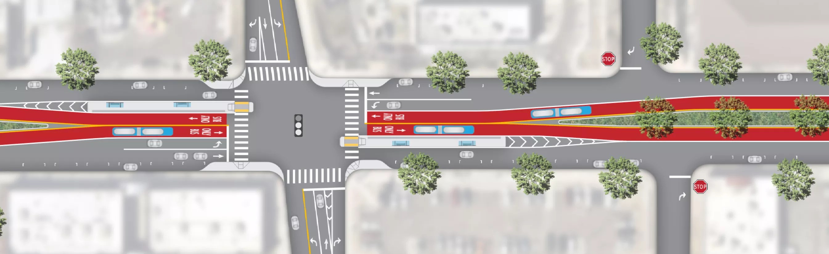 “This has benefit for the buses and for the passengers, that you don’t have conflicts with turning vehicles,” Monroe says. “Left turns are separate, and you don’t have any right turns going in and out of driveways along the corridor. You don’t have to worry about parking, either.”