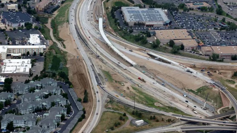 A bird’s-eye view of the interchange linking C-470 and I-25.