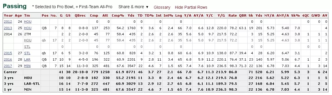 So what do the Broncos have in Keenum? A look at his career stats as compiled by Pro Football Reference won’t take your breath away: