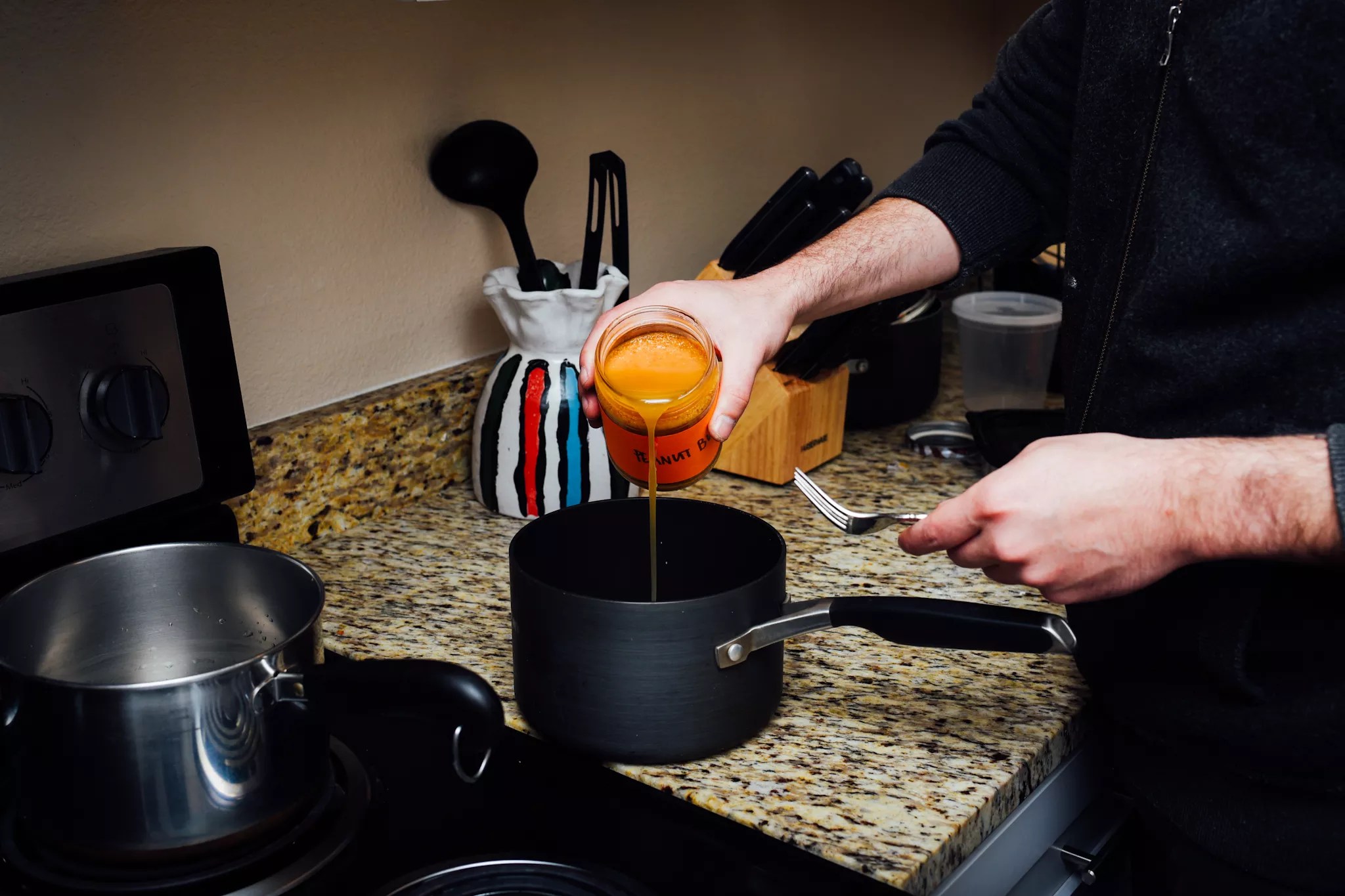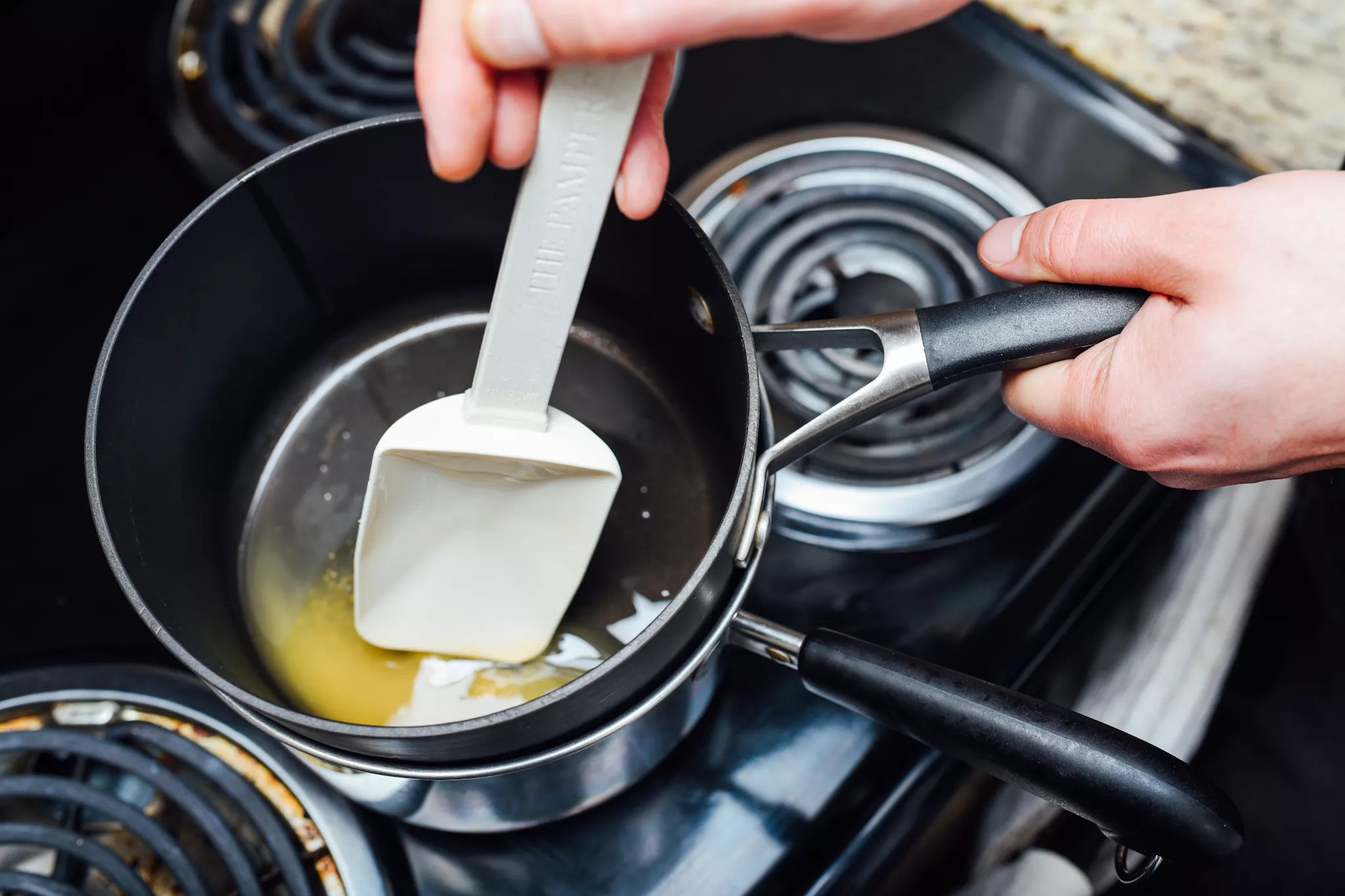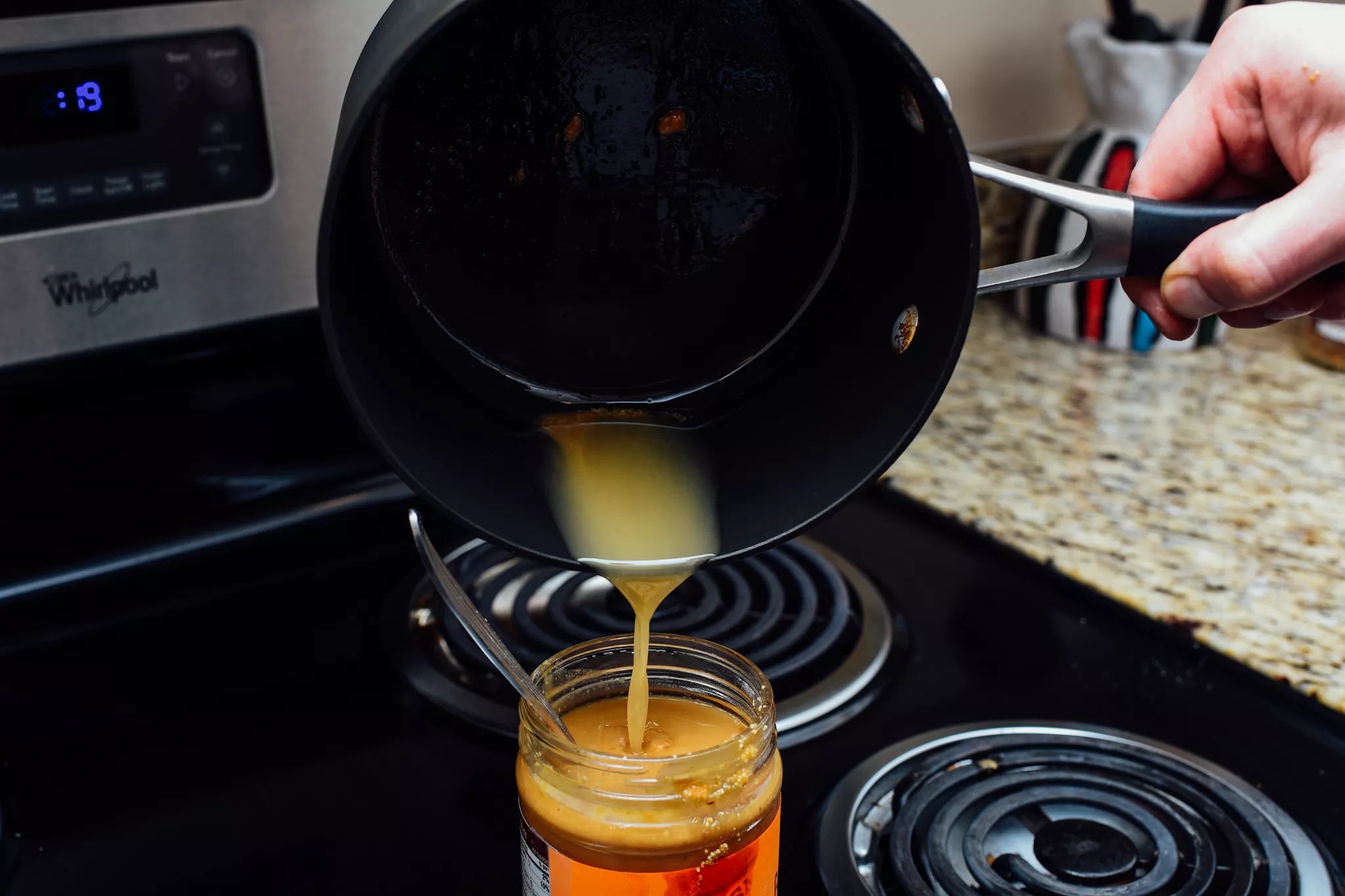 Cook for three to five minutes, stirring occasionally. Remove the top pan, and let the oil cool for a few minutes. Pour the oil back in the peanut butter container, and carefully (but thoroughly) stir it back in. Refrigerate for thickness before first use.
