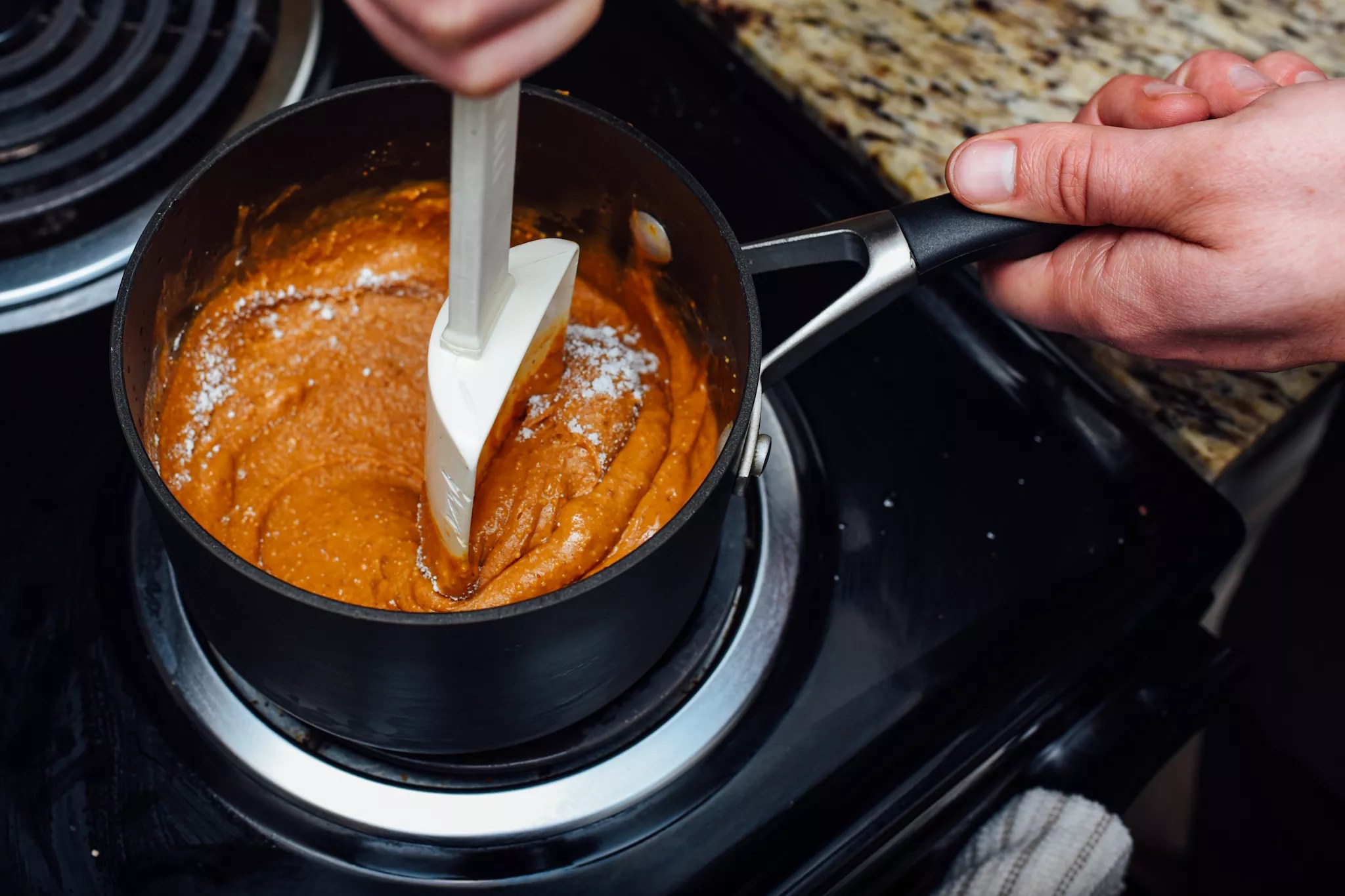Stir the peanut butter frequently to ensure that the bottom doesn’t stick to the pan or burn. Do this for about ten minutes, then remove from heat and let it cool for a few minutes while still stirring. Pour into a container and refrigerate for thickness.