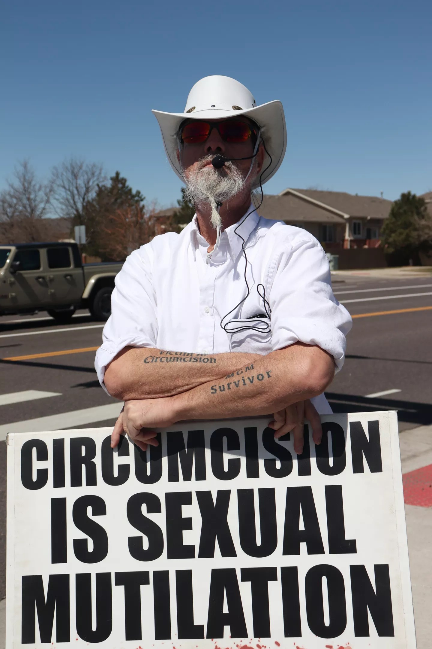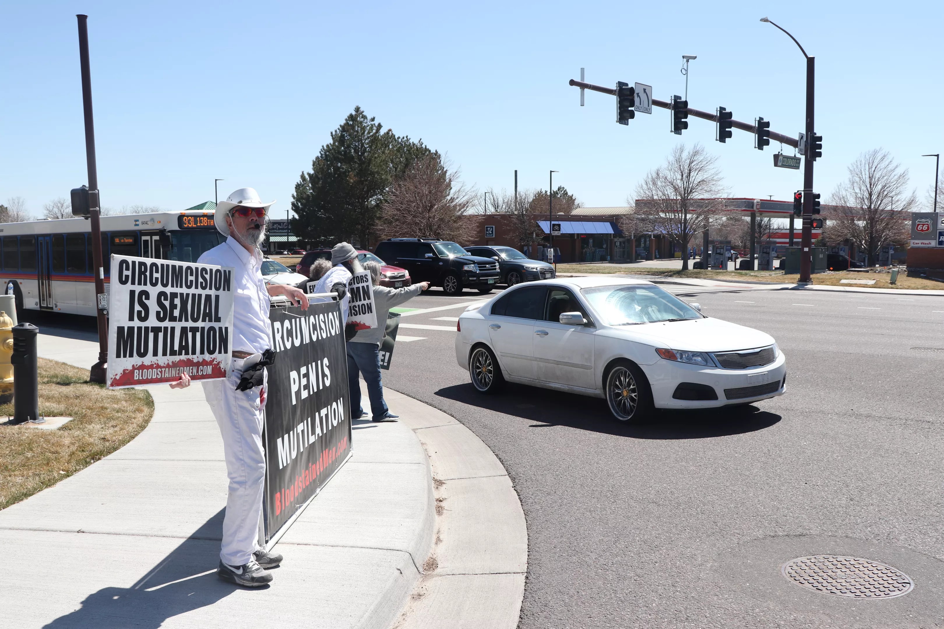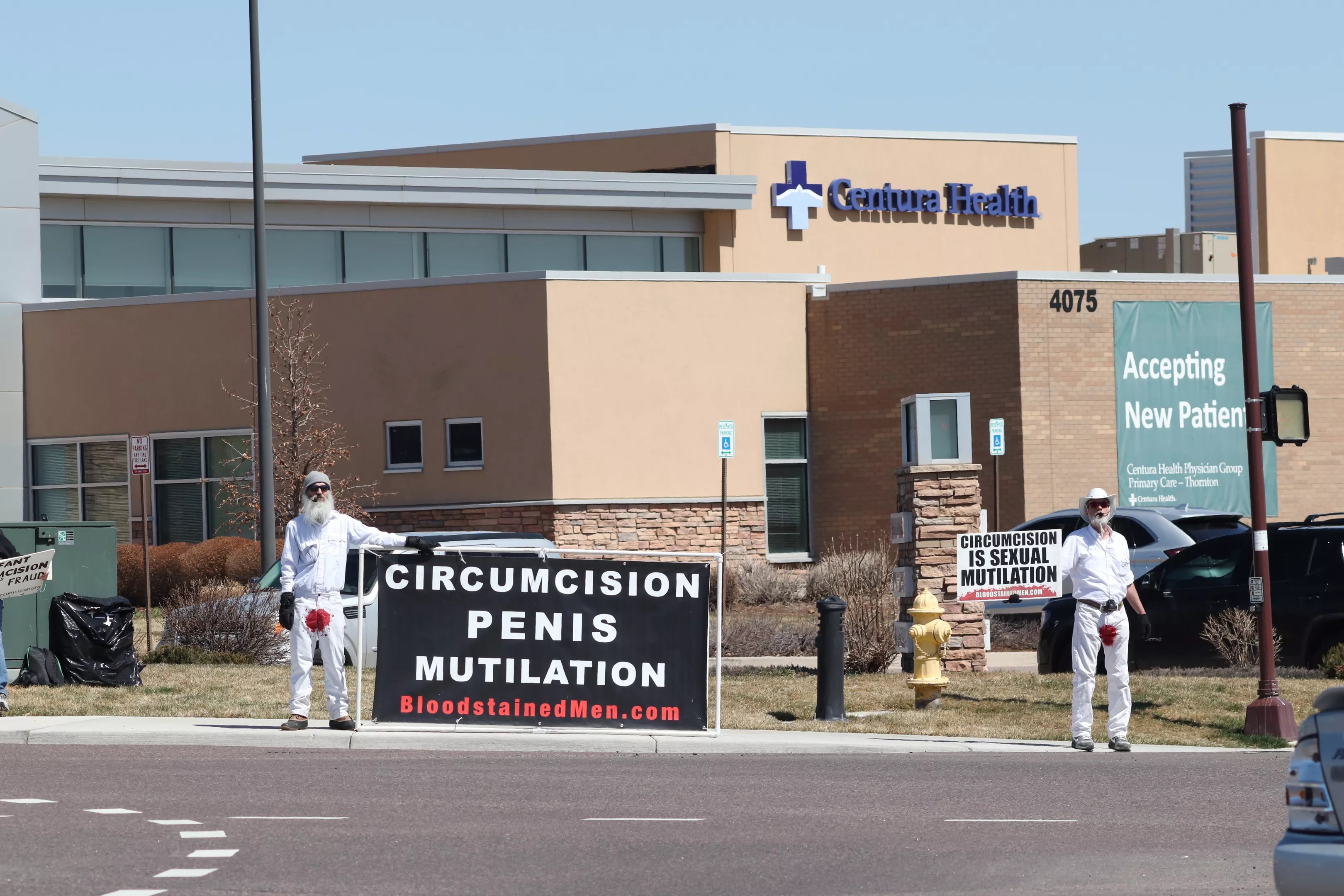 Standing outside of Centura Health Primary Care in Thornton on April 6, two men dressed in all-white garb – except for a large, blood-red mark on the crotch of their pants – faced traffic and held a large sign saying, “CIRCUMCISION PENIS MUTILATION.”
