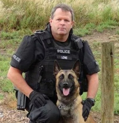 Lakewood Police Department Agent Patrick Lone seen posing with a different K-9 – not Finn.