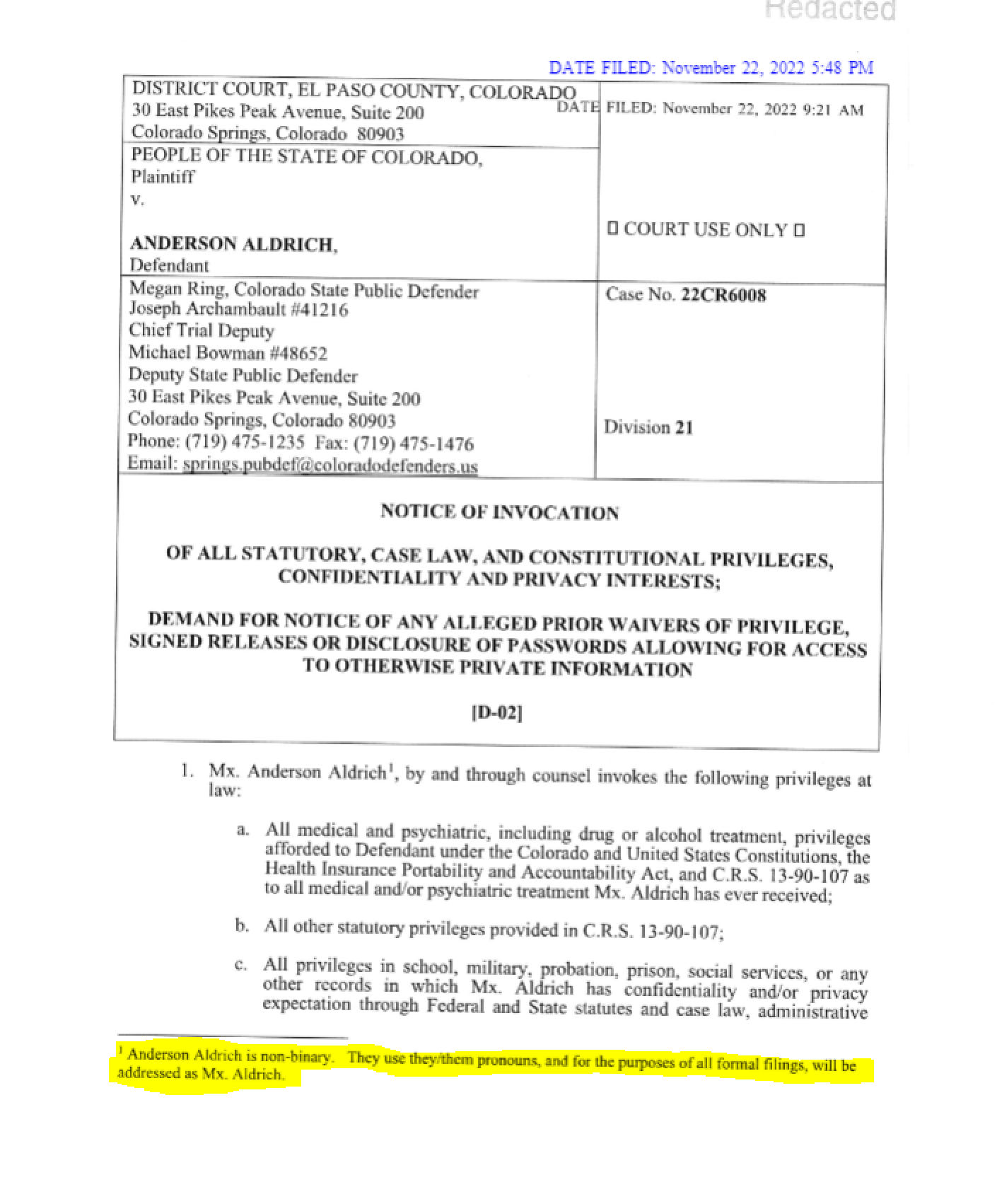 Hours later, in a document time-stamped at 5:48 p.m., the gunman’s public defenders, Megan Ring, Joseph Archambault and Michael Bowman, added a key footnote to their invocation of client rights: “Anderson Aldrich is nonbinary. They use they/them pronouns, and for the purposes of all formal filings, will be addressed as Mx. Aldrich.”