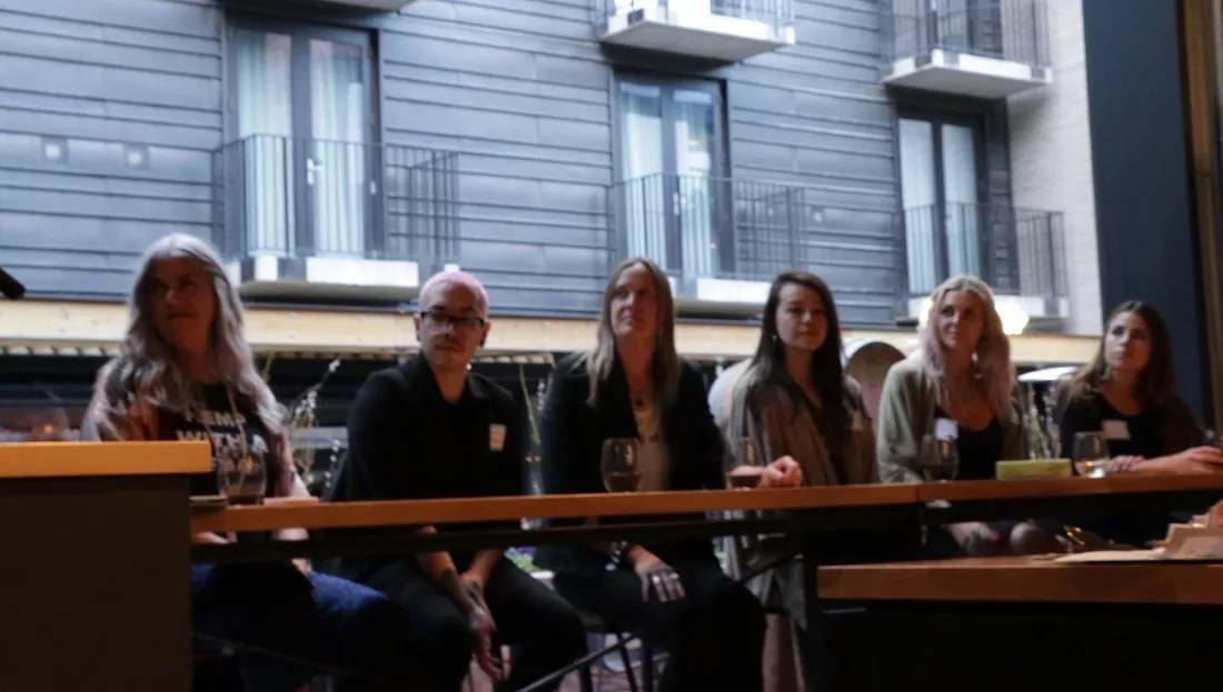 (From left) Pauline Marie Buller, Ernesto Prada, Deb Henriksen, Melissa Joy, Anna Duff and Christina Bellman talk about sustainable business practices at Blanchard Family Wines in downtown Denver.