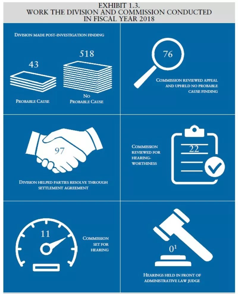 Complaints don’t always make it all the way through the process. Another graphic contained in the report breaks down the commission’s work in fiscal year 2018. Over that span, 1,693 complains were filed, but only 518 – fewer than a third – reached the post-investigation-finding stage. Moreover, 43 cases, or fewer than 10 percent, were found to have probable cause.
