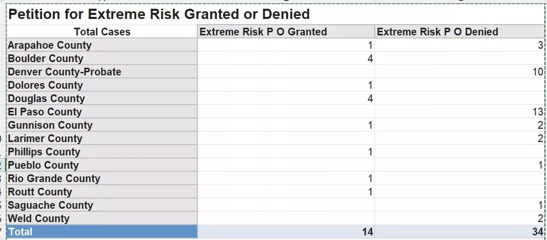 To date, thirteen motions to renew extreme risk protection orders have been filed in Colorado, and twelve of those were granted. The only exception was in Jefferson County.