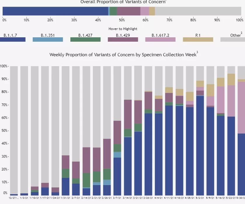 The CDPHE page devoted to COVID-19 data now includes a chart that reveals variants of concern and their rising impact from late last year through the week of May 30, the most recent for which statistics are available. This screen capture from the site shows the changes over time: