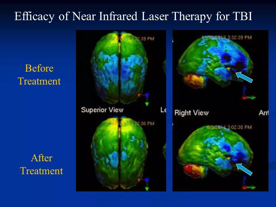 The partnership behind the Neuro-Laser Foundation consists of Theodore Henderson, a psychiatrist, and Larry Morries, a chiropractor. They say they have treated close to a hundred TBI patients over the past four years, with more than 90 percent reporting some benefit from the procedure, which typically consists of twenty sessions over several weeks. The pair have published several articles in peer-reviewed journals touting the use of lasers in TBI treatment and presenting “before” and “after” brain scans as proof that their approach leads to measurable changes in brain function. Their website and press releases boast that they’ve developed “a method of giving damaged brain cells new life” and a way for their patients to “Say Goodbye TBI.”