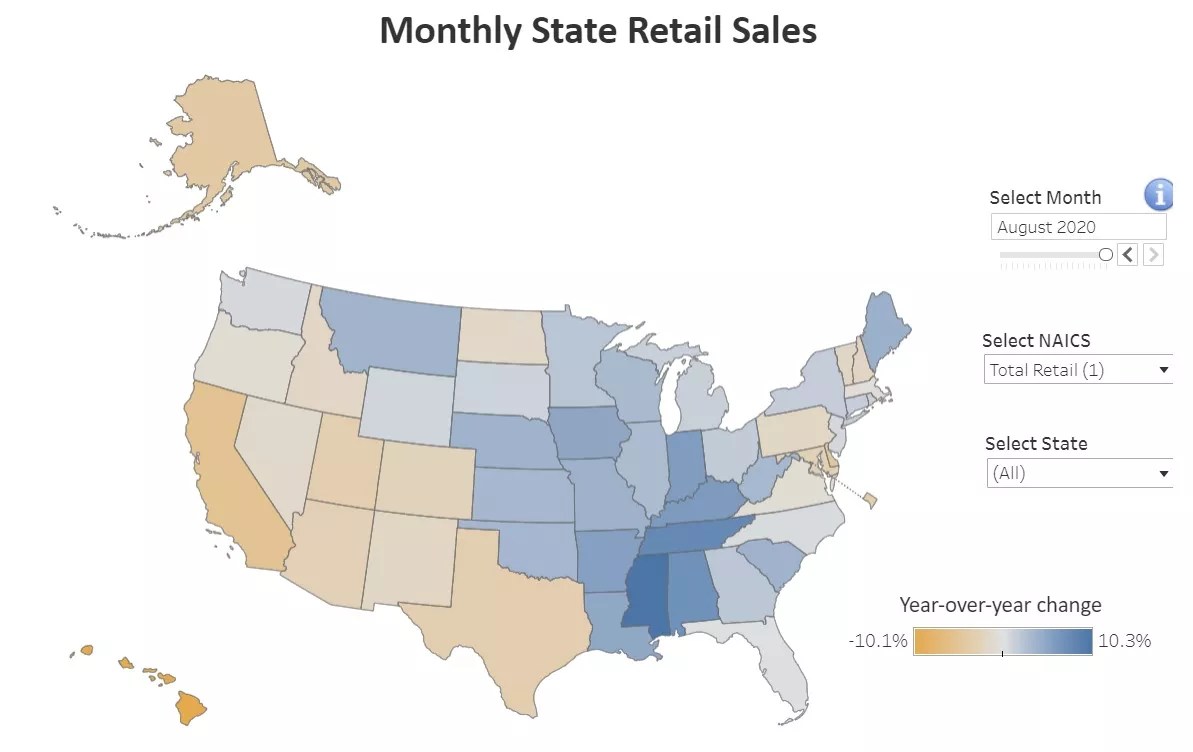 The U.S. Census monthly retail sales graphic for August 2020. Blue states showed sales increases year over year, while those in shades of brown, including Colorado, experienced declines.