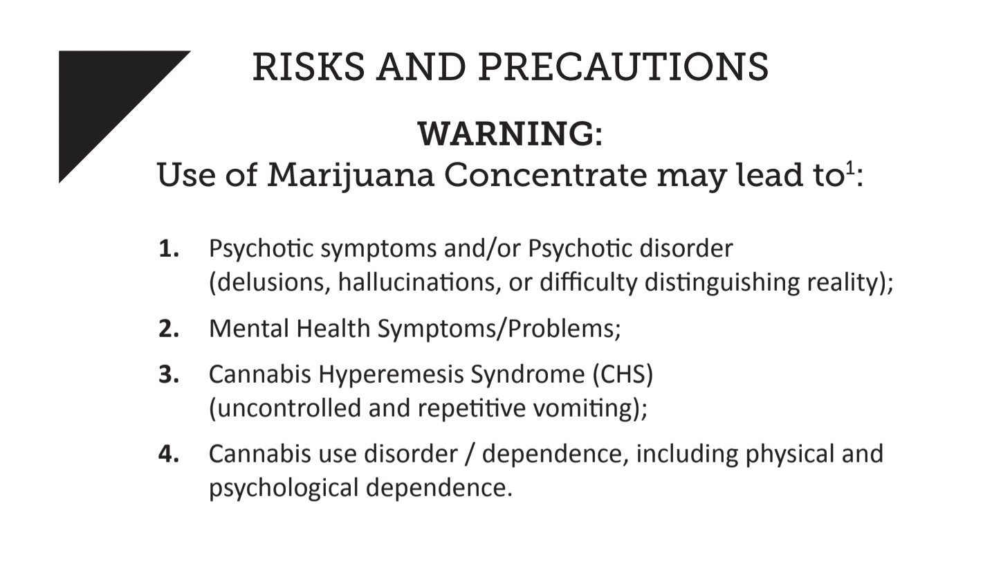 The state-approved pamphlet includes a suggested serving size for marijuana concentrates: a small dot on packaging that is slightly smaller than a half-grain of rice. Information about the differences between vaporizing and smoking THC, the short- and long-term risks of consuming high-potency THC products, and the penalties for selling legal marijuana products on the black market will also be printed on the pamphlet.