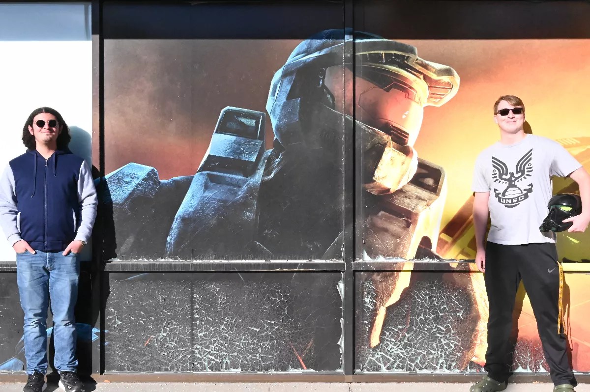 Brenden Poteet and Ben Morlan stand outside the Halo 3 window mural of the Glendale GameStop.