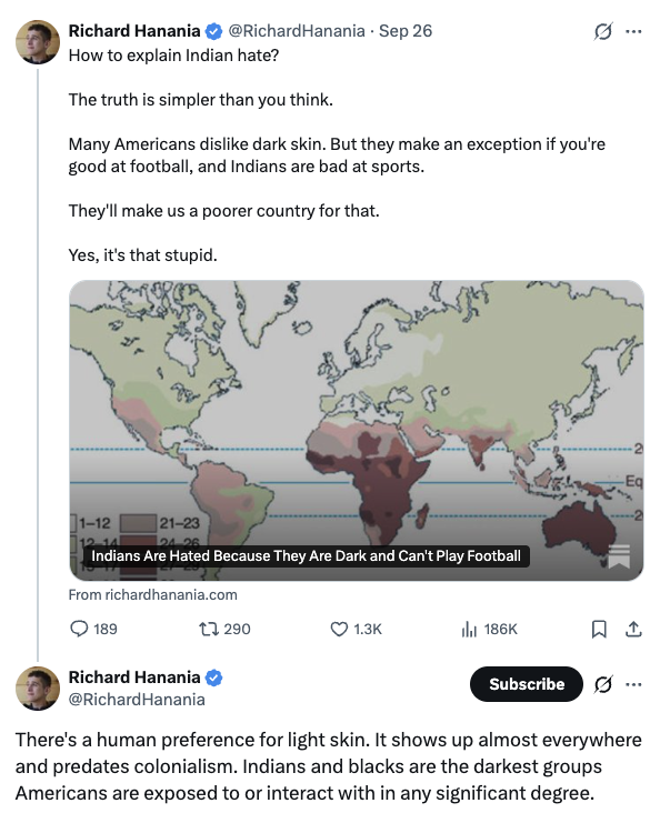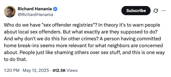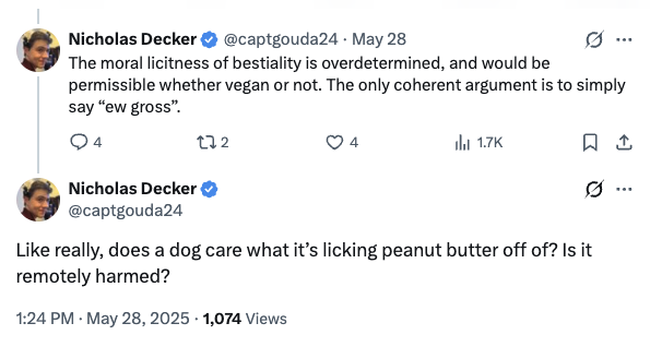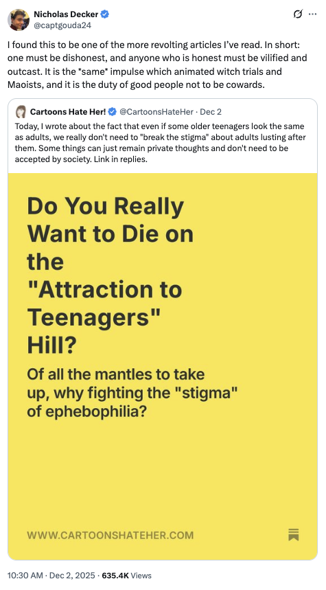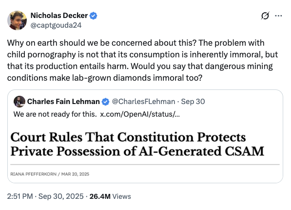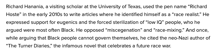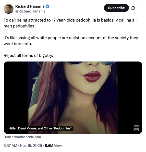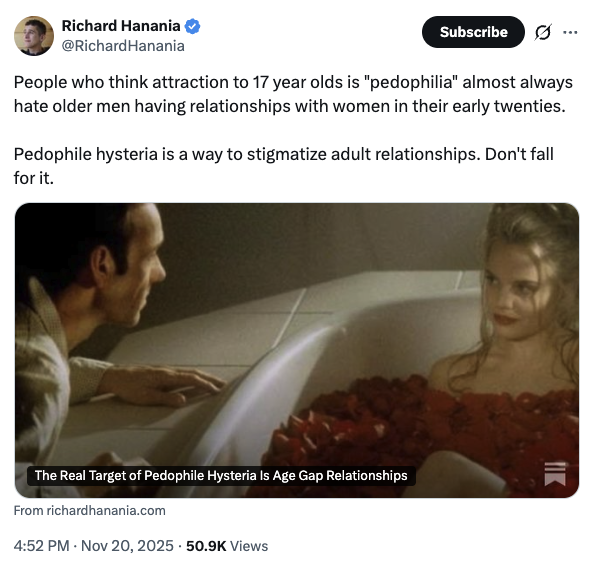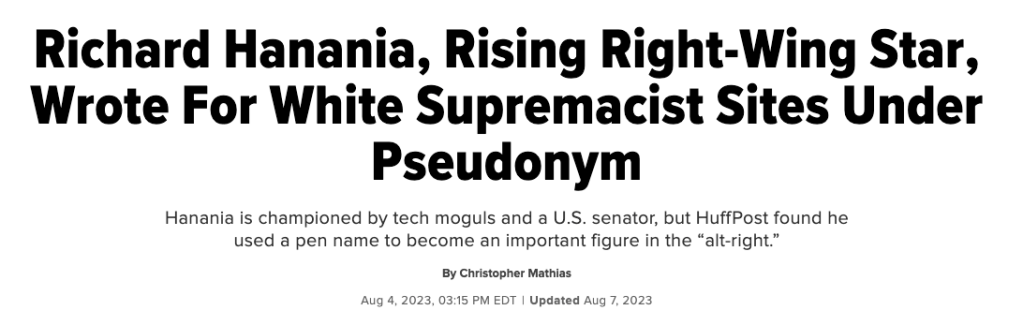 Hanania spent years writing for white supremacist publications, expressing support for eugenics and opposition against “race-mixing.” Decker has posted frequently in defense of various sex crimes, including consuming AI-generated child pornography and having sexual relations with minors and animals.