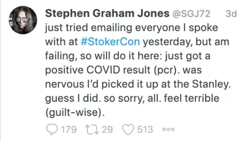 The next day, May 10, a StokerCon pre-party was staged at the Stanley Hotel in Estes Park – an inspiration for author Steven King’s The Shining. Shortly thereafter, another author, Stephen Graham Jones, referenced the bash in a tweet about his own case of COVID.