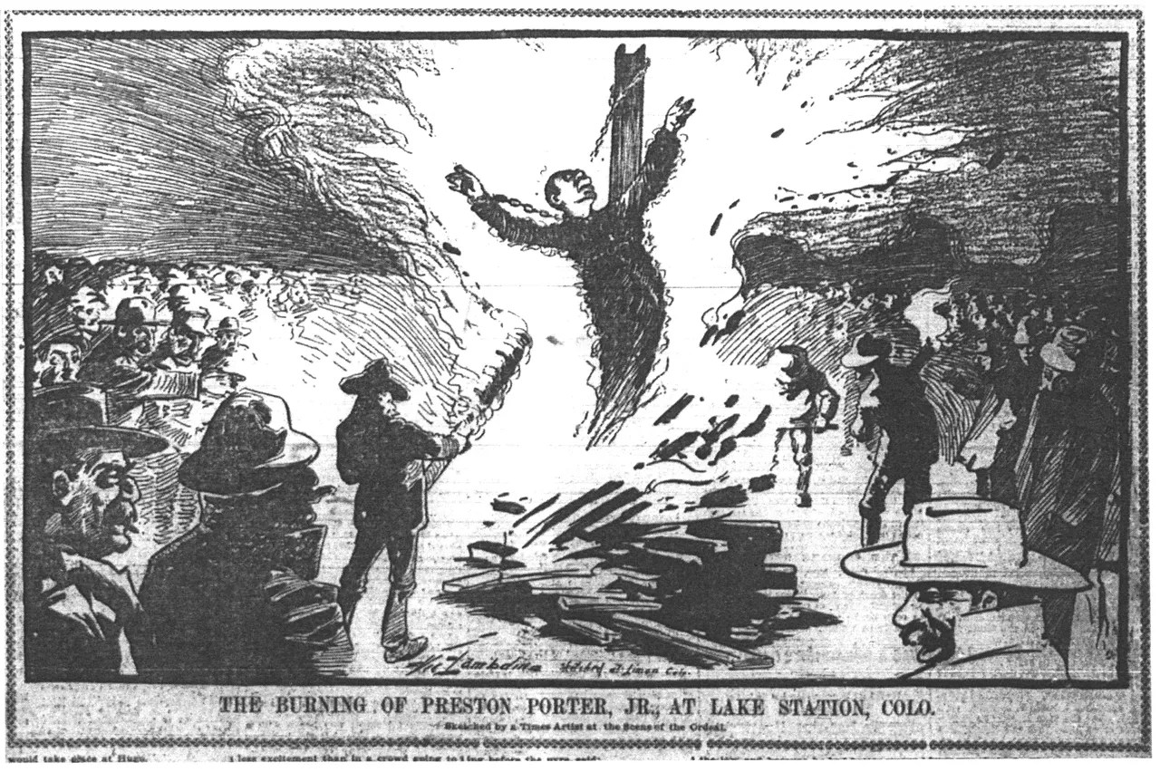 As it turned out, Frost’s murder wasn’t even the most fiendish crime to be perpetrated that month. For pure sadism, for cold-blooded, premeditated, murderous intent, her death was easily overshadowed by the vengeance that followed. On November 16, Preston Porter Jr., a sixteen-year-old African-American railroad worker, was led by a rope around his neck to the spot where Frost had been found. Chained to an iron rail, with kerosene-soaked wood piled around him, he was burned alive while hundreds of people watched. Some of the crowd had come by train from Denver and Colorado Springs to attend the spectacle.