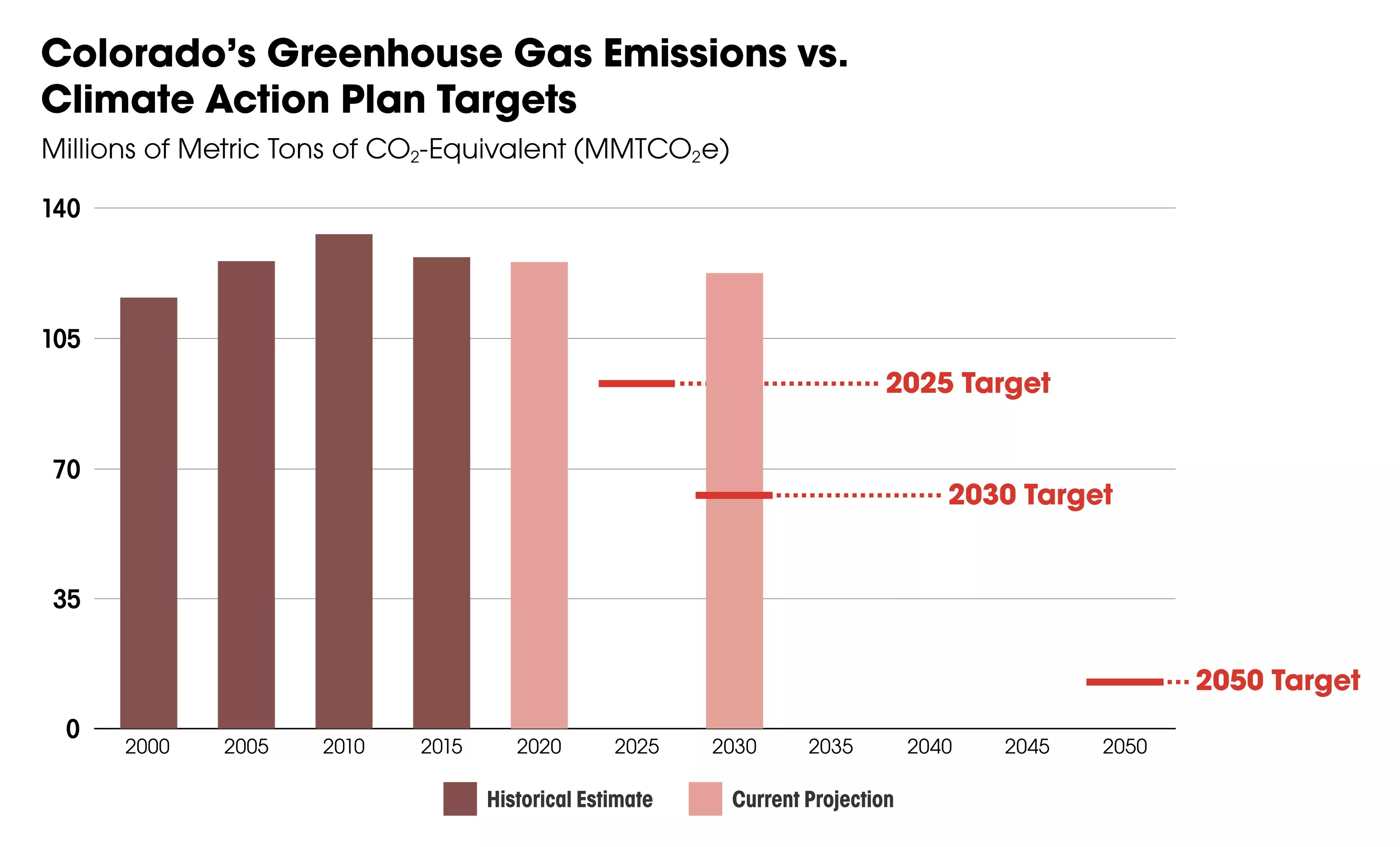As of this year, Colorado has a set of emissions targets formally enshrined in state law. House Bill 1261, dubbed the Colorado Climate Action Plan and signed by Polis in May, commits the state to a 26 percent emissions cut by 2025, a 50 percent cut by 2030 and a 90 percent cut by 2050. If there’s anything that CDPHE’s new Greenhouse Gas Inventory makes clear, it’s that Colorado is nowhere near on track to meet those goals: The report’s projection for statewide emissions in 2030, about 122 million tons, is almost double the 63-million-ton target set by HB 1261.