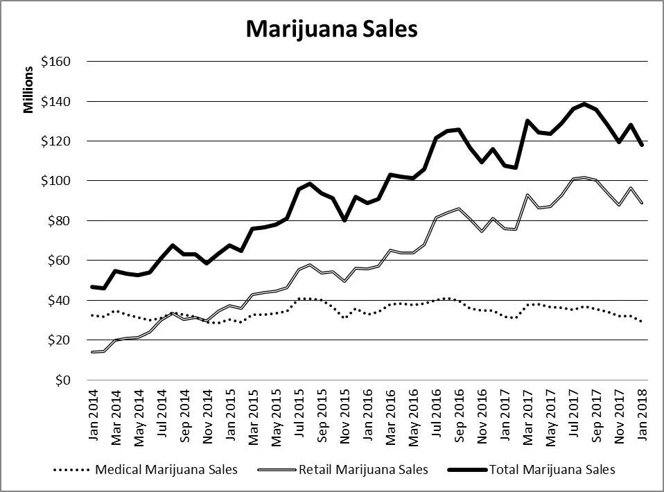Recreational sales continues to be the driving force in Colorado, with retail revenue growing from around $76 million in January 2017 to $88.7 million – a 16.7 percent increase. Medical sales, however, are falling below a flatline, with January 2018’s numbers nearly 8 percent lower than those from January 2017.
