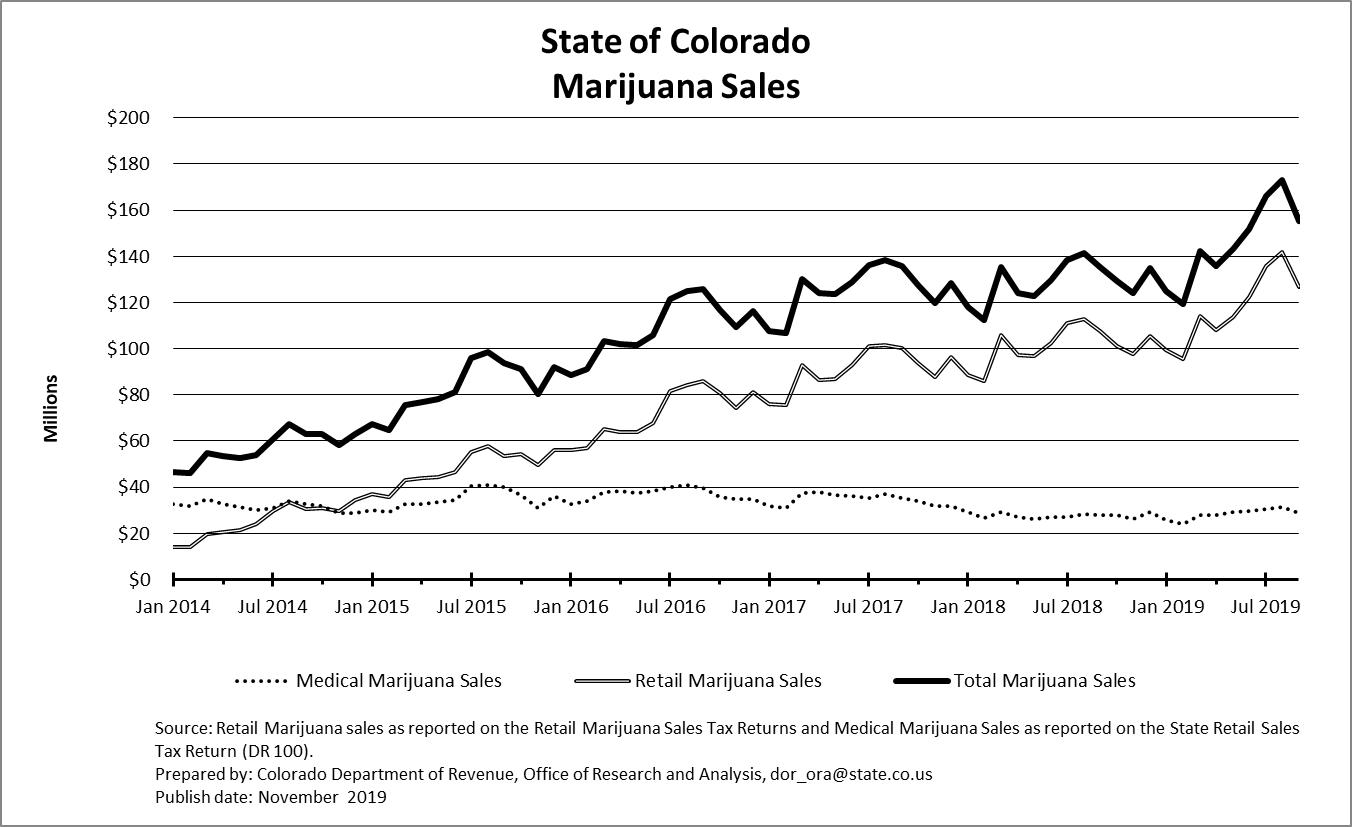 In all of 2018, DOR data shows legal pot accounted for a little over $1.54 billion in sales and $266.5 million in tax revenue. Since recreational pot sales began in Colorado in January 2014, dispensaries have accounted for over $7.35 billion in sales and approximately $1.15 billion in tax revenue.