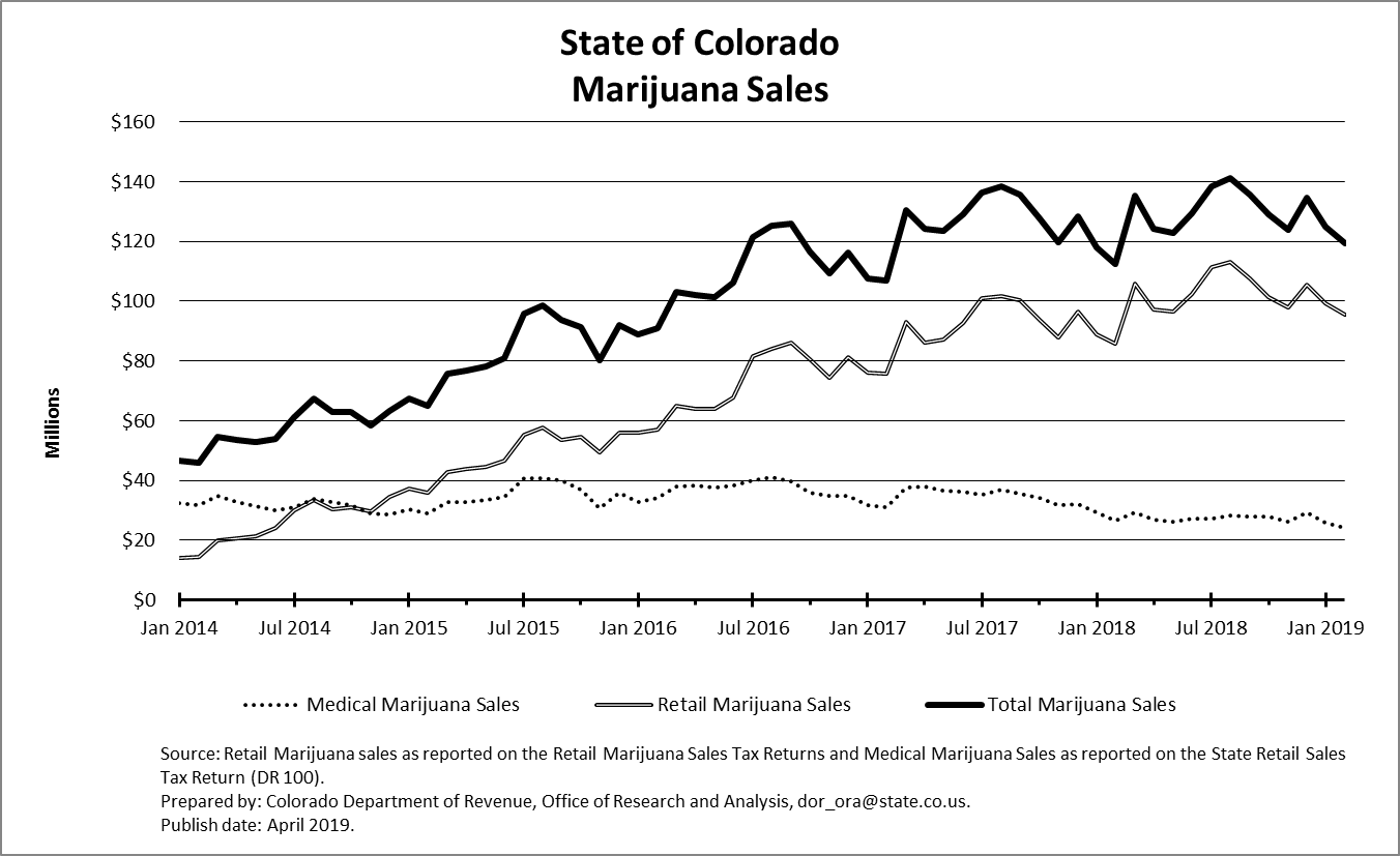 Dispensaries in Colorado collected more money in 2018 than in any previous year, topping $1.54 billion. While this year is still young, the combined $244.3 million in sales logged during the first two months of 2019 is outpacing last year, topping 2018 sales during the same period by around $14 million.