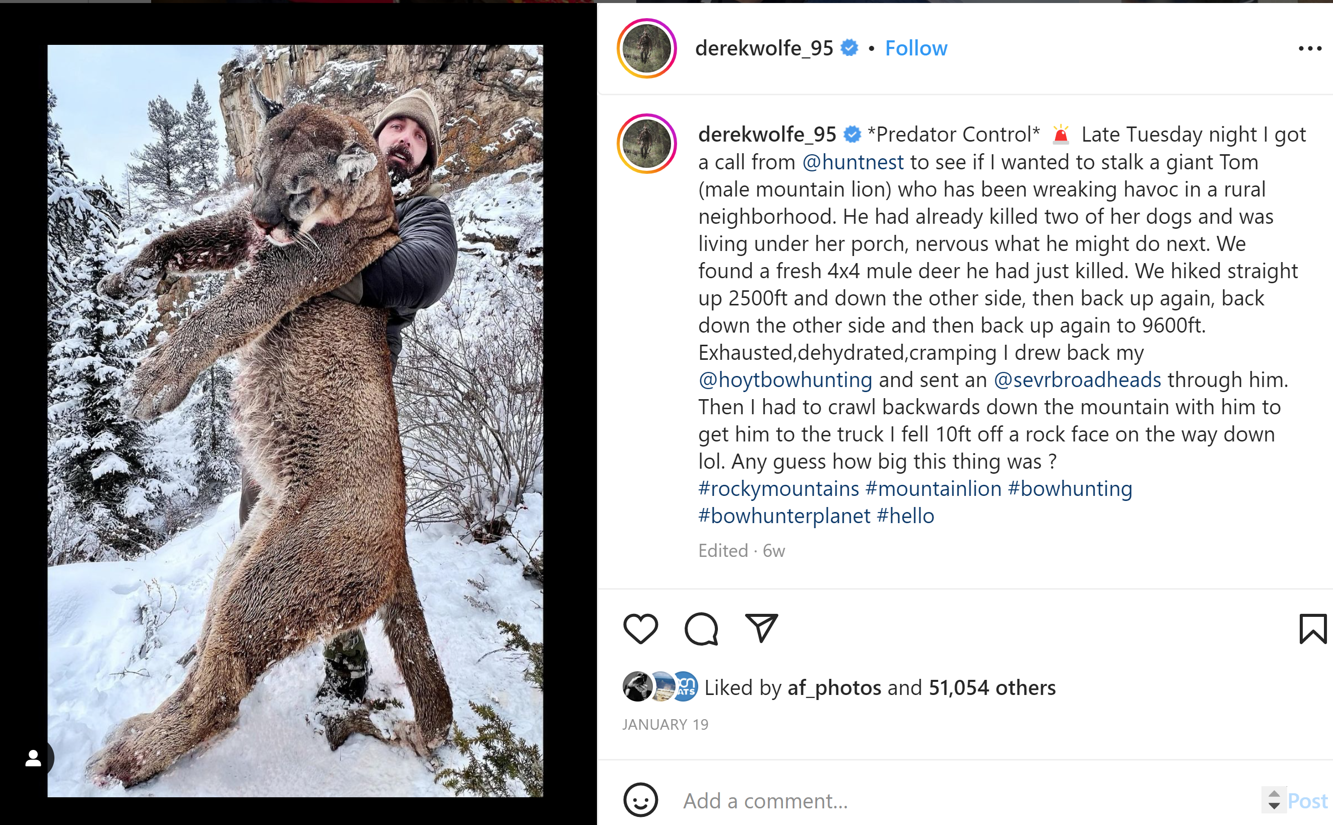 And on January 19, former Broncos player Derek Wolfe – an enthusiastic hunter – had posted on Instagram about how he had (legally) hunted and killed a mountain lion using a bow and arrow. Wolfe said the lion had been “wreaking havoc in a rural neighborhood” – which turned out to be Grant, southwest of Denver.