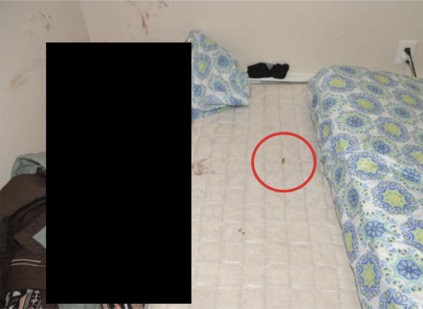 A crime scene photo, included in a 2020 arrest warrant for Mario Raymond Sanchez. Alicia Tverberg’s body was partially censored in the original photocopy, then further censored by Westword.