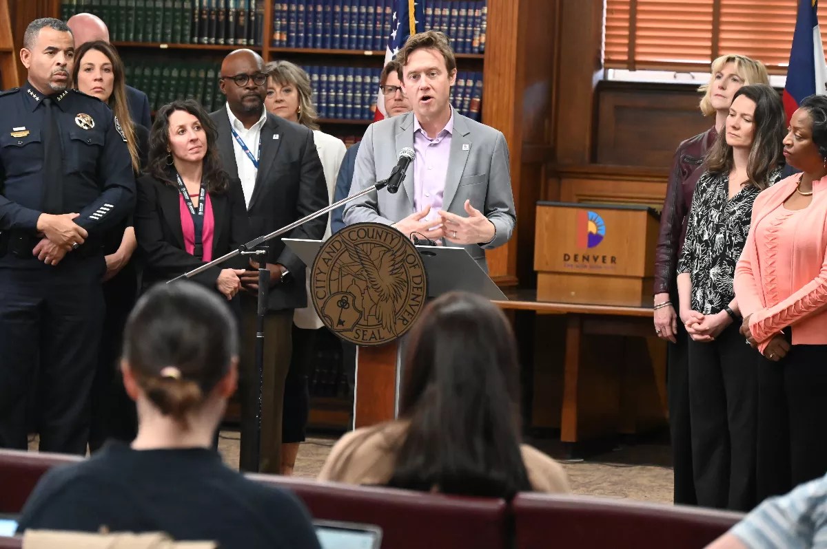 Mayor Mike Johnston answers a question in Spanish during a press conference.