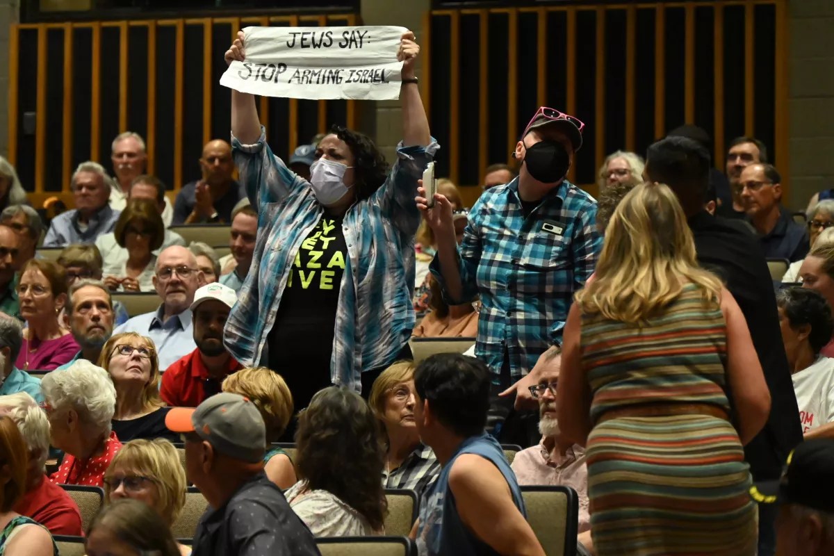 A protester stood and began shouting towards Crow about halfway into the town hall. She waived a flag that said “Jews Say: Stop Arming Israel.” Although incoherent at first, she began singing “stop the war bombs” as she was escorted out. There were a handful of protesters waving Palestinian flags and telling attendees on their way in that Crow supports Israel’s war in Gaza, as well.