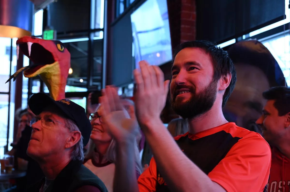 Team captain Luke Quintal applauds as he watches BattleBots with friends, family and fans.