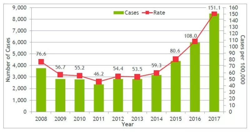 The rate of chlamydia during 2017 – 481.3 cases per 100,000 people – represents a 23.0 percent increase since 2013. The syphilis rate was more than two times higher: 14.6 cases per 100,000 people, a 61.5 percent leap over the same span. And the 151.3 cases of gonorrhea per 100,000 people is up 182.3 percent in five years.