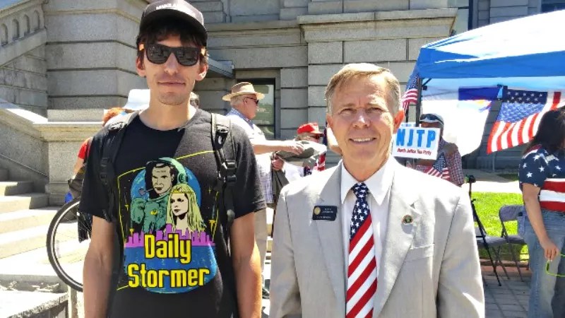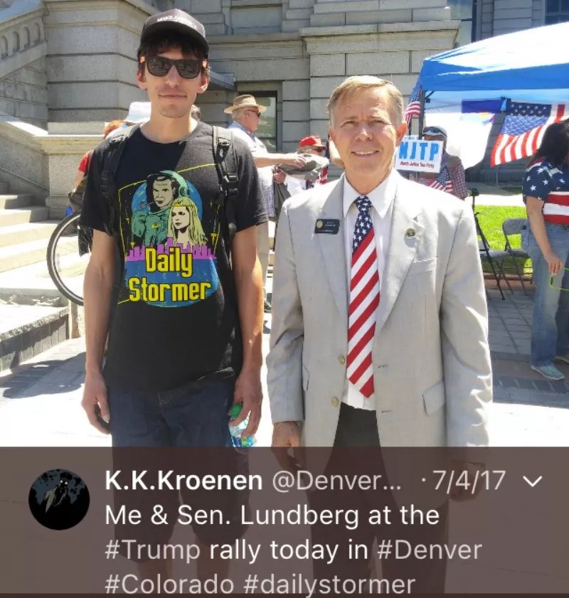 Update below: A photo has surfaced in which state senator Kevin Lundberg, a Republican from Larimer County, is seen alongside Joshua Yeakel, a reputed neo-Nazi with ties to William Scott Planer, an alleged white supremacist who was arrested in Colorado Springs this summer. In the image, taken at a pro-Donald Trump rally in July, Yeakel is wearing a T-shirt that references The Daily Stormer, a website that appeals to extremist groups. But Lundberg says he had no idea about Yeakel’s background or the meaning of the shirt when he smiled for the shot, and rejects any suggestion that he was consciously cozying up to the alt-right.