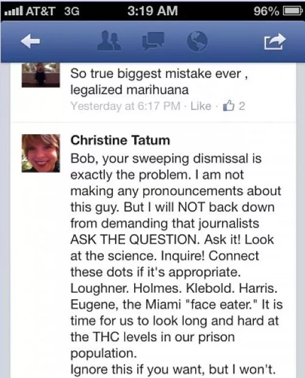 The article acknowledged Tatum’s connection to Thurstone, but it failed to point out that she’s a longtime opponent of marijuana legalization who’d stirred controversy by suggesting pot links to events such as the Boston Marathon bombing and the killings at Columbine High School.