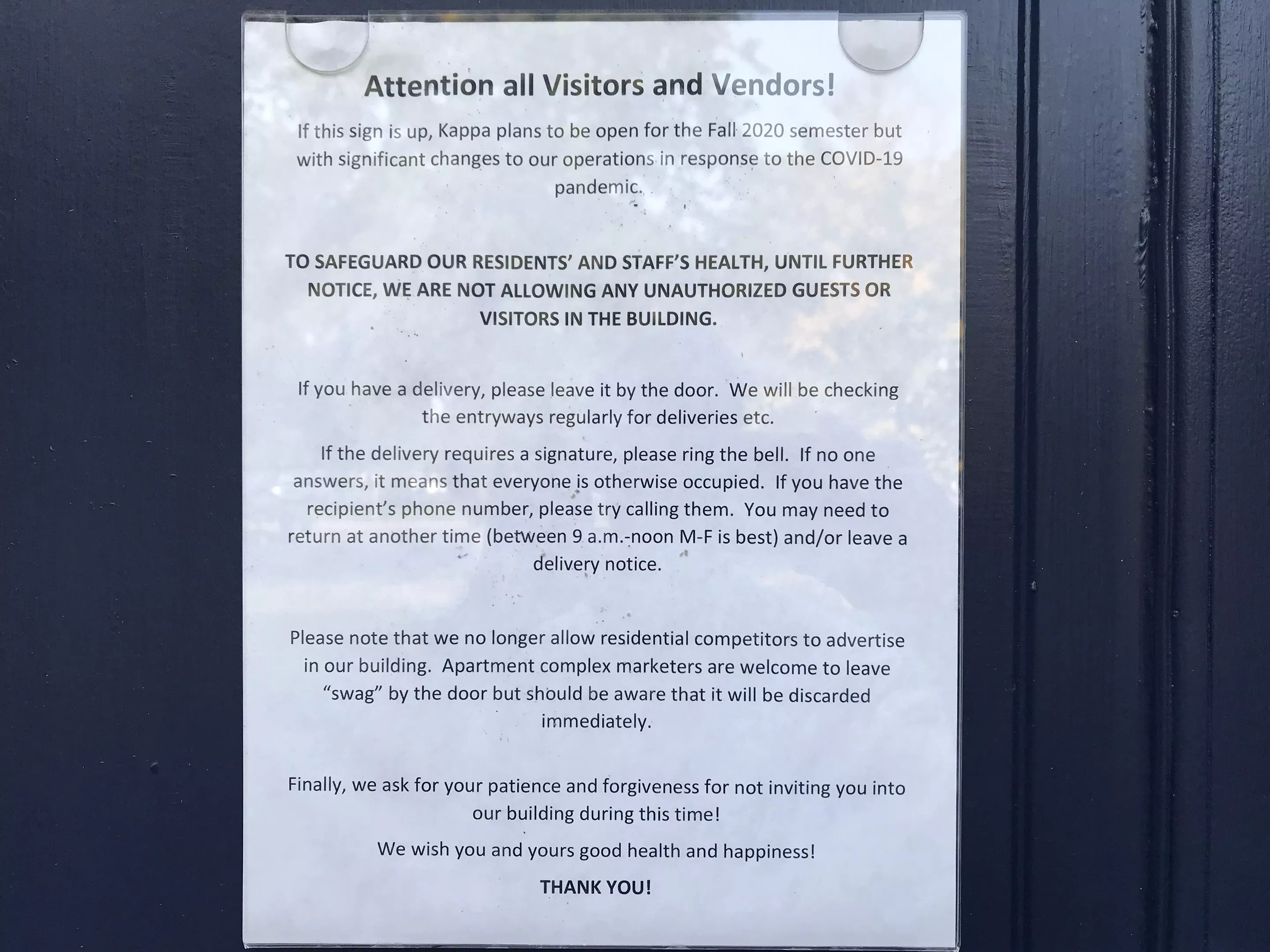 Things were even quieter near the frats and sororities. We didn’t spot a single student outside, and a sign on the front door of the Kappa Kappa Gamma sorority made it clear that only a special few could gain admittance. An all-caps sentence stated: “TO SAFEGUARD OUR RESIDENTS’ AND STAFF’S HEALTH, UNTIL FURTHER NOTICE, WE ARE NOT ALLOWING ANY UNAUTHORIZED GUESTS OR VISITORS IN THE BUILDING.”
