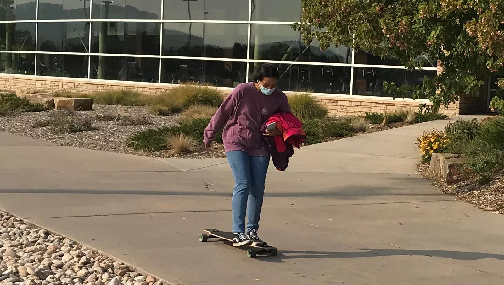 No one was playing basketball on the main outdoor courts, leaving a wide expanse open for a single skateboarder to turn lonely circles. A few small groups of two or three students could be found here and there on the nearby green space; some were masked even though the distance between them and others could often be measured in hundreds of yards. We saw several people riding stationary bikes in the exercise center, but all of them were masked, and none were anywhere near each other. An impromptu volleyball game staged on the grass because the main pits had been designated as off-limits was pretty much the height of activity.