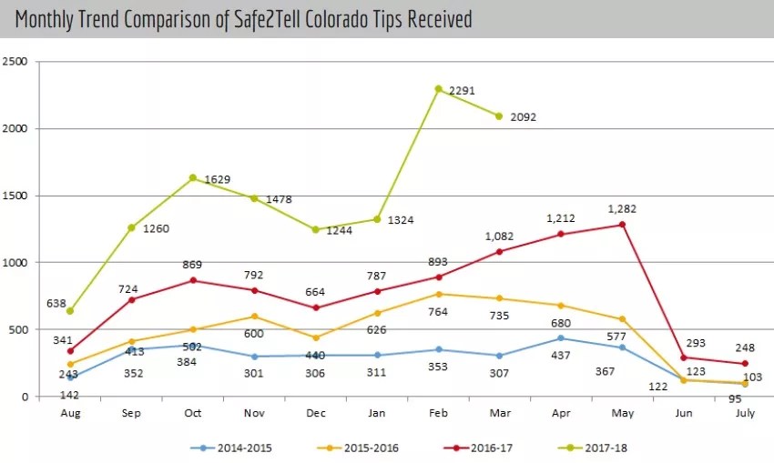 Over that stretch of time, student reports to Safe2Tell increased thanks to aggressive outreach efforts and the realization that the anonymity of those making reports really would be protected. But the numbers truly mushroomed three years ago, with the introduction of a mobile app (get it here). It’s now commonplace for Safe2Tell to receive more than 1,000 reports per month, and of late, that digit has more than doubled.