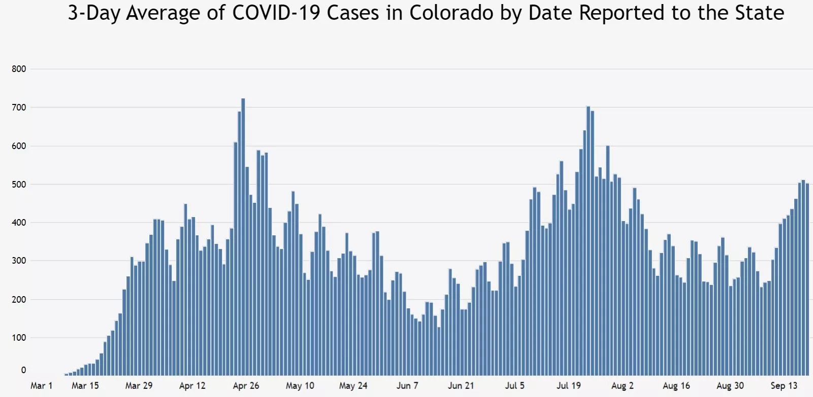The 549 new cases registered on September 17 are the most for a single day since the 586 counted on July 30. Likewise, the three-day average of cases on September 19, calculated at 502, is the highest since 517 on August 1, near the end of the second major spike that Colorado experienced. The two previous bumps and the recent rise are depicted in the following CDPHE graphic: