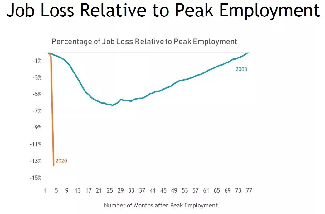 This scenario is captured visually by the graphic below labeled “Job Loss Relative to Peak Employment,” which shows the line for 2020 doing a swan dive more breathtaking than anything current Olympic gold medalist Chen Aisen could ever hope to accomplish.